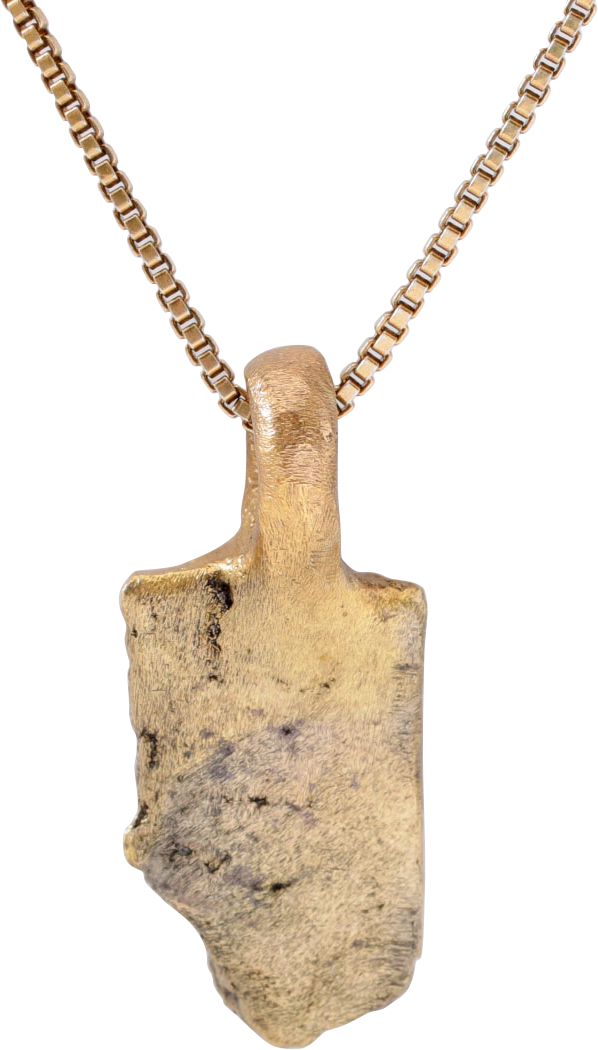 10th-11th century AD. Vikings were highly skilled metallurgists, and as a result, breaking metal had supernatural significance for them. Breaking ringjarn (iron rings) as shown on the Larbro Stone in Gotland, Sweden, was thought to destroy the spirits of enemies. Similarly, Viking weapons and accouterments were broken for burial with their owners. This is the broken end of a fine Viking warrior’s bronze bracelet. It is about 3/8” x 5/8’ of thick section with rounded face with punch decorated borders. It is lightly textured from burial. It has been professionally refurbished with a 24karat gold overlay and mounted to an 18” gilt sterling silver neck chain for modern wear. It comes with a certification of authenticity and is jewelry gift boxed.