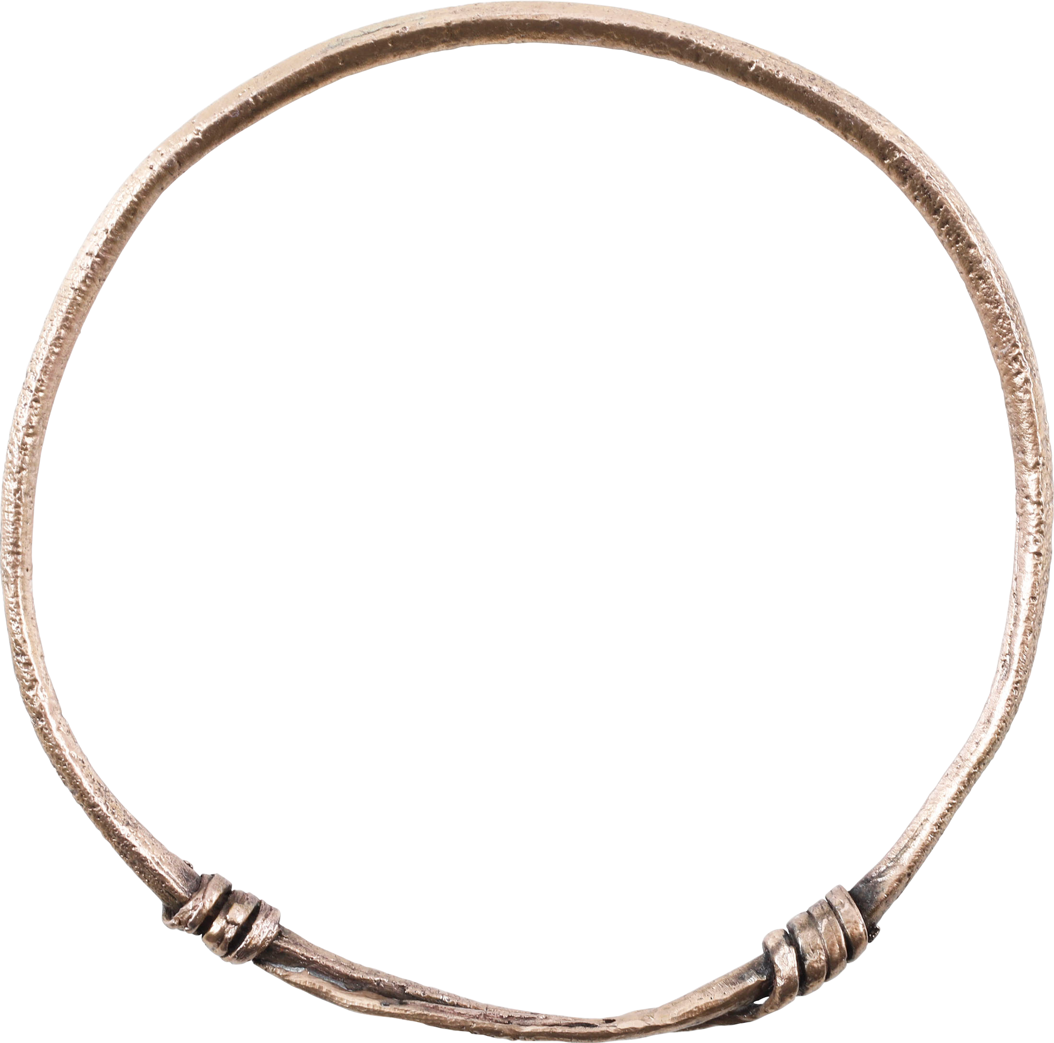 Gilt bronze, just under 3” (2.98”) inside dimension. Round section with over lapping tapered terminals, coiled, securing the ends. Professionally refurbished with the 24karat gold surface restored. Gift boxed with certificate of authenticity.