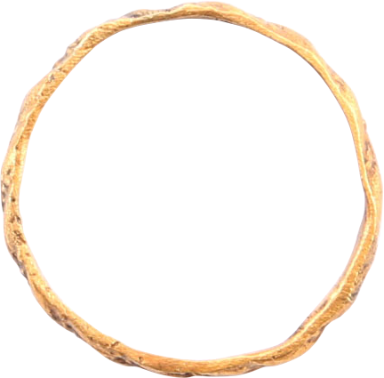 Gilt bronze, size 6 3/4. 2.1mm width band of rounded section formed as a spiral or roped, with a fine stipple segment alternating with the main twist. See Medieval Jewelry in Europe 1100-1550, V & A Museum, pl.4 for the Fishpool hoard (England and France, 1100-1160) for very similar examples. Fine crisp preservation. Professionally refurbished with the 24karat gold surface restored. Gift boxed with certificate of authenticity.