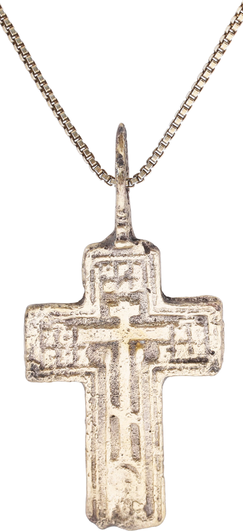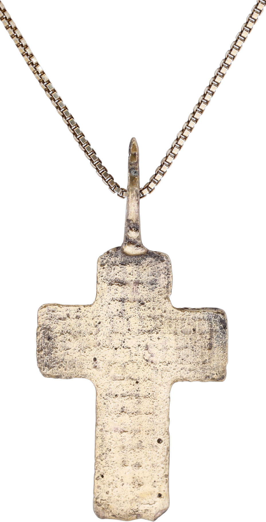Orthodox rite. Gilt bronze, just under 1 ½ (1.44”) height. Broad beams with raised edges and a plain cross center with charges above. Reverse with raised edge and Cyrillic text infill. Surface textured from burial. Professionally refurbished with the 24karat surface restored, mounted on an 18” gilt Sterling silver neck chain for modern wear. Gift boxed with certificate of authenticity.