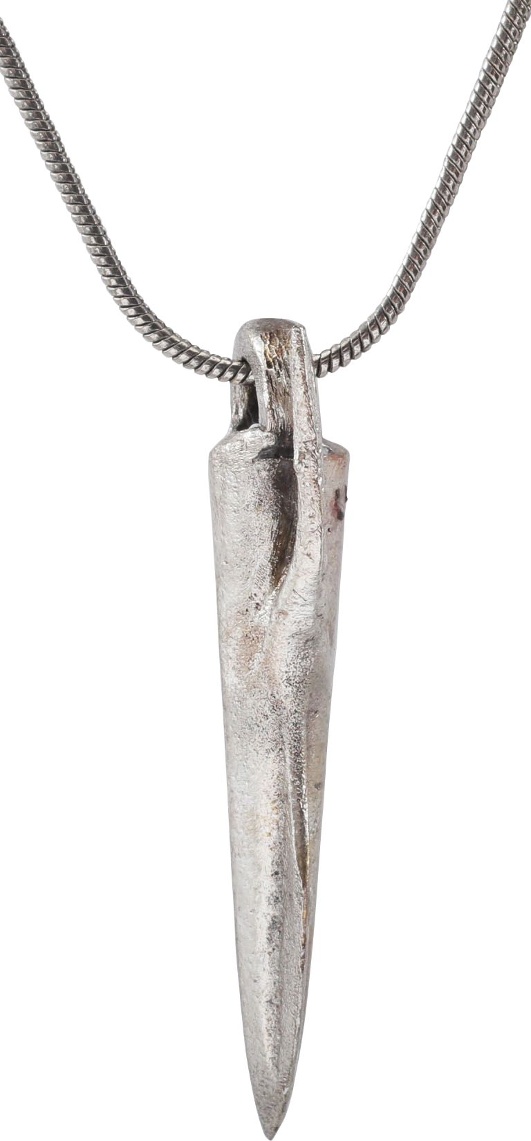 Bronze, about 1 ½” (1.45”) length. Bilobate form with conical socket and base barb. Rare form in excellent preservation with the delicate barb completely intact. Professionally refurbished with a silver overlay and mounted on an 18” modern sterling silver neck chain for contemporary wear. Jewelry gift boxed with certification of authenticity.