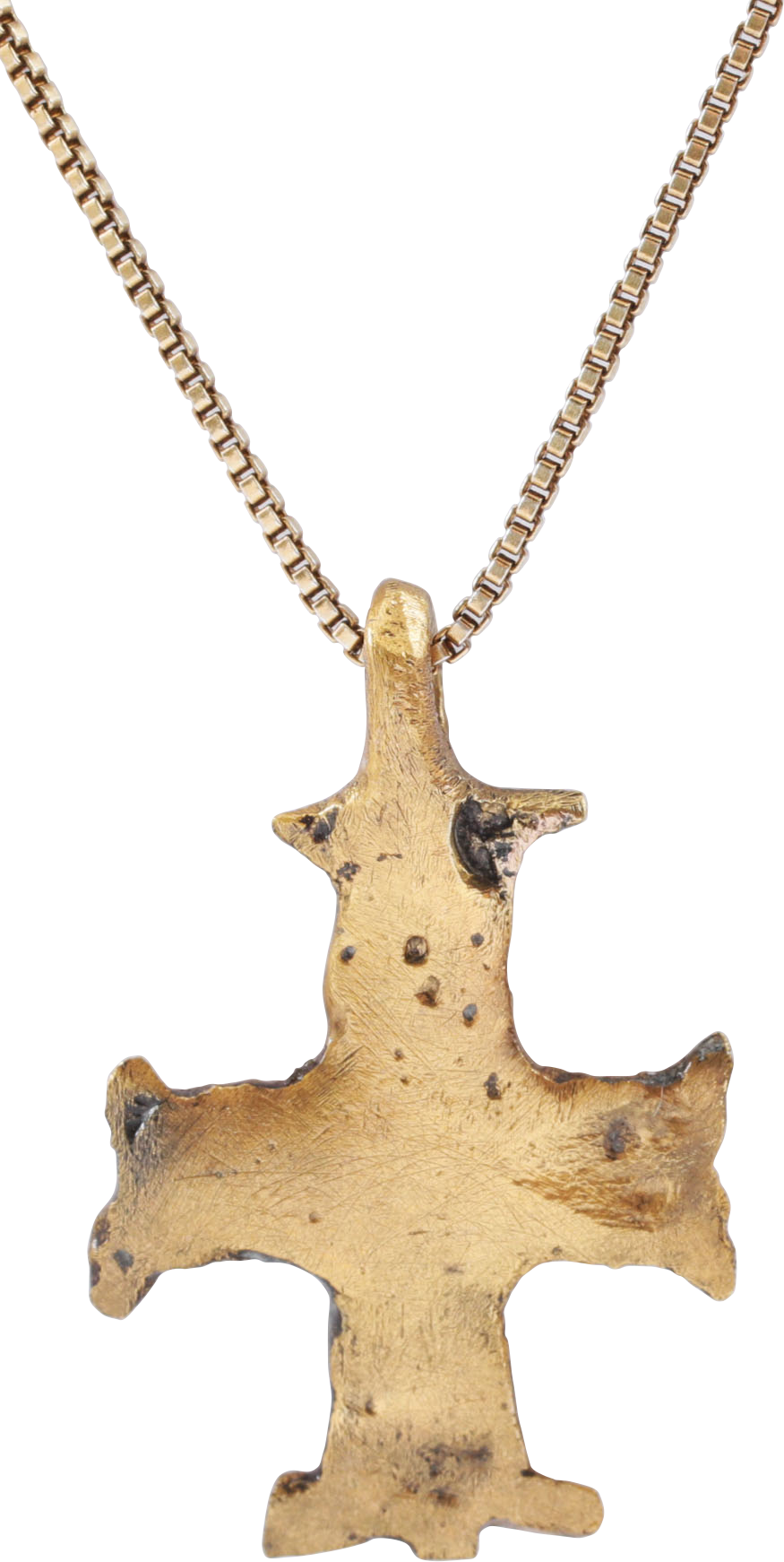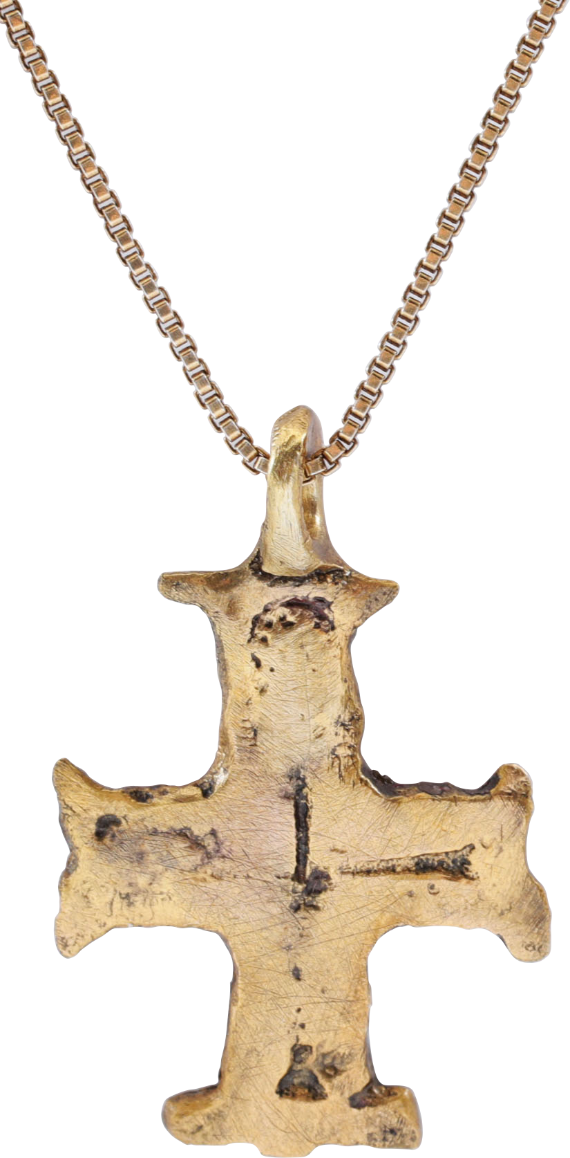 8th-12th centuries. Just over 1” (1.05”) in height. Broad beams, the cross beam centered. Each with bifurcated terminals as adopted by the Knights Hospitaller as the Maltese Cross. The front incised with a stick cross and the back plain. Made by the open face mold technique. Carried by European Pilgrims traveling to the Holy Land to visit the land where Christ lived and died. Provincial example with quaint workmanship and original tool marks preserved. Professionally refurbished with the 24karat gold overlay restored, on an 18” gilt sterling silver neck chain for contemporary wear. Gift boxed with certificate of authenticity.