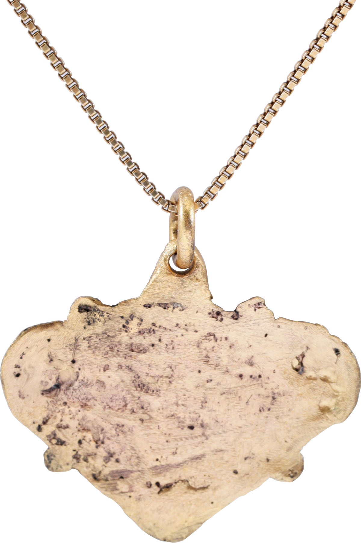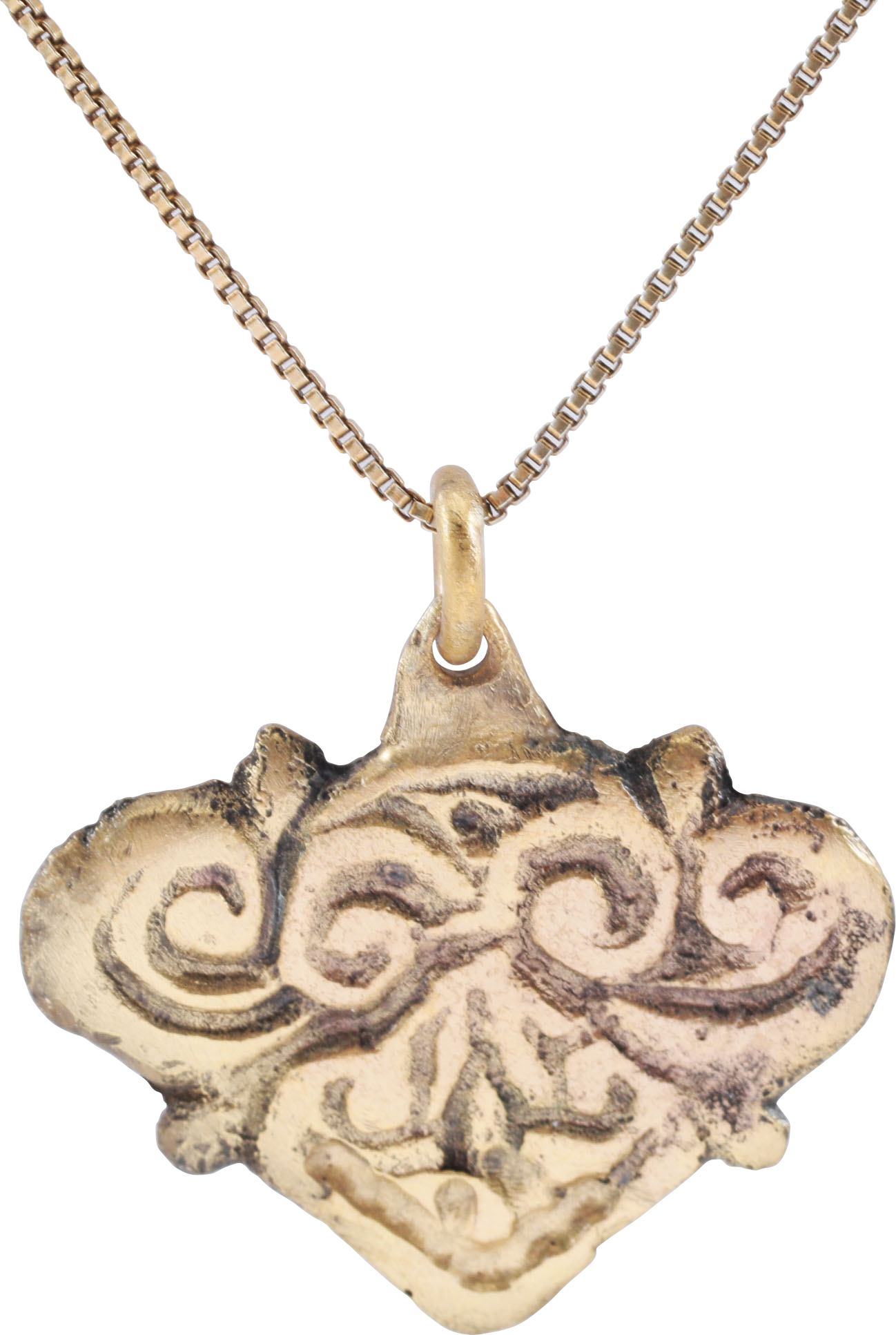 Gilt bronze, over 3/4” (0.77”) height plus the suspension loop. Heart form made up of three elaborately scrolling foliate segments. The three cumulatively based on the Viking trefoil. The form clearly referencing the earlier Viking era heart. As with many, this Christian era pendant is in fact an amulet embracing the earlier Pagan beliefs or superstitions. Professionally refurbished with the 24karat gold overlay restored, on a modern 18” gilt neck chain and gift boxed with a certificate of authenticity.
