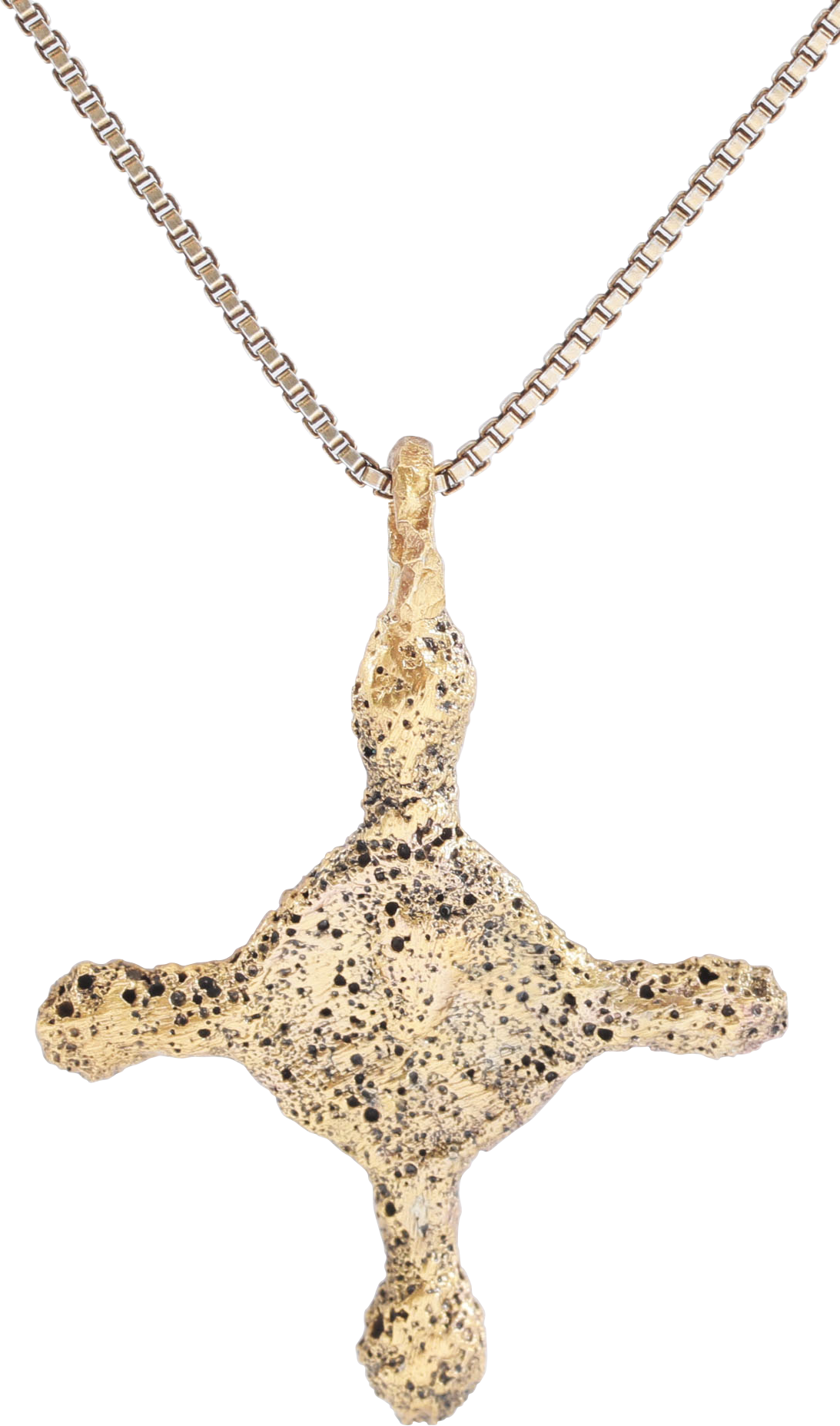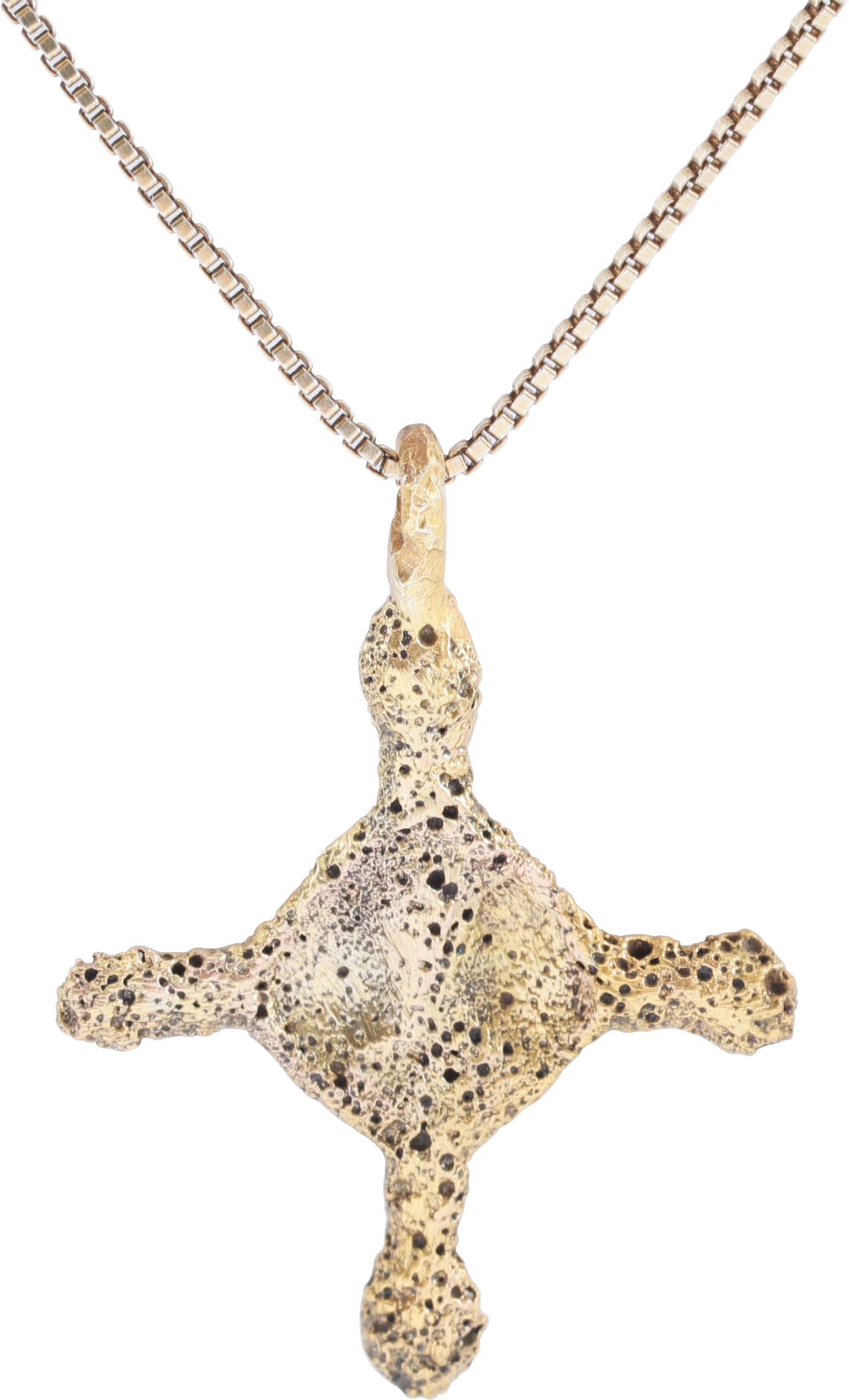 The emergence from the Dark Ages is embodied in the rise to power of the Frankish King, Charlemagne in 768 (founder of the Holy Roman Empire after 800) followed by conquering southern Europe from France to Italy and much of Northern Europe. The condition for peace was acceptance of Christianity, under penalty of death. Conversion was effective and Northern Europeans, primarily Saxons, wore small crosses to affirm their Christianity. This example is over 1 1/8” (1.18”) in height with a centered cross beam and a block at the junction with a ghostly figure on each side. The bulbous beam terminals have small nub ends. Surface textured from burial throughout. Professionally refurbished with 24karat gold overlay restored on a gilt neck chain for modern wear.