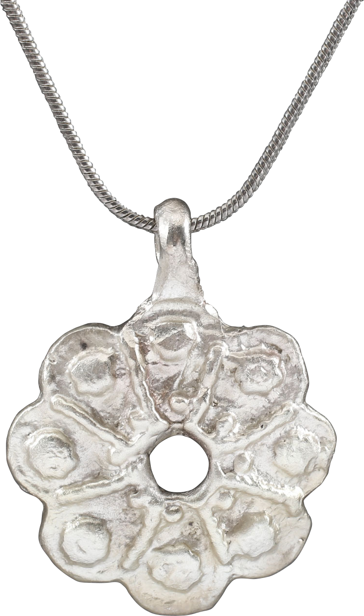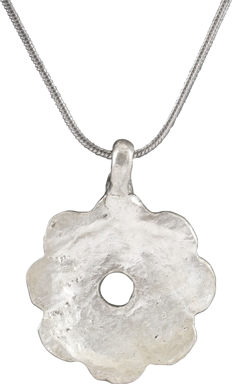 This amulet is slightly under 1” (0.98”) diameter, made by the open face mold technique, with high relief representation of an eight spoke wheel of domed form and a scalloped edge with a pierced central hub and matching nubs between the spokes. It has been professionally refurbished with the silver surface restored. It is mounted on an 18” Sterling silver necklace for modern wear. Gift boxed with certificate of authenticity.