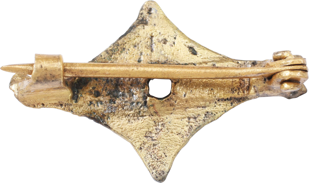 Gilt bronze of cusped side elongated triangle form with bifurcated terminals and large concentric circle with pierced center representing the evil eye. Intended to protect the wearer against those empowered to do harm by their evil glance, a common theme in Roman pagan religion. Gilt bronze, well detailed. Professionally refurbished with the 24karat gold surface restored with intact cross pin and wearable. Jewelry gift boxed with certificate of authenticity.
