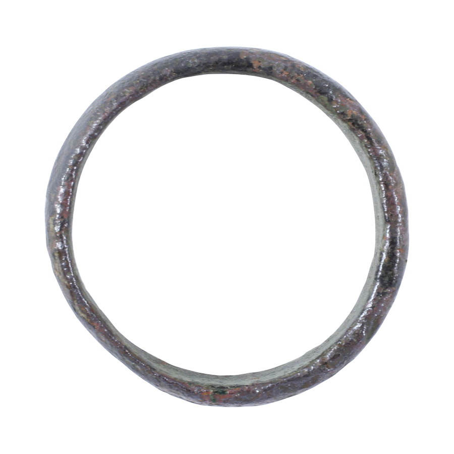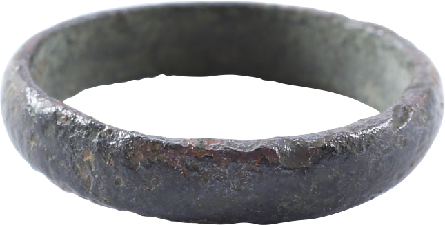 Bronze, in condition as found. Size 4 1/2, 3.7mm width. Deeply rounded face. As found condition with fine patina. A woman’s ring worn on the small finger as was the custom. Jewelry gift boxed with certificate of authenticity.