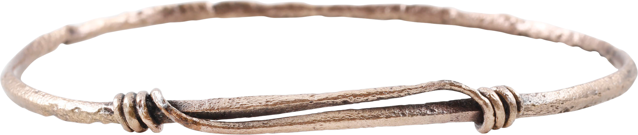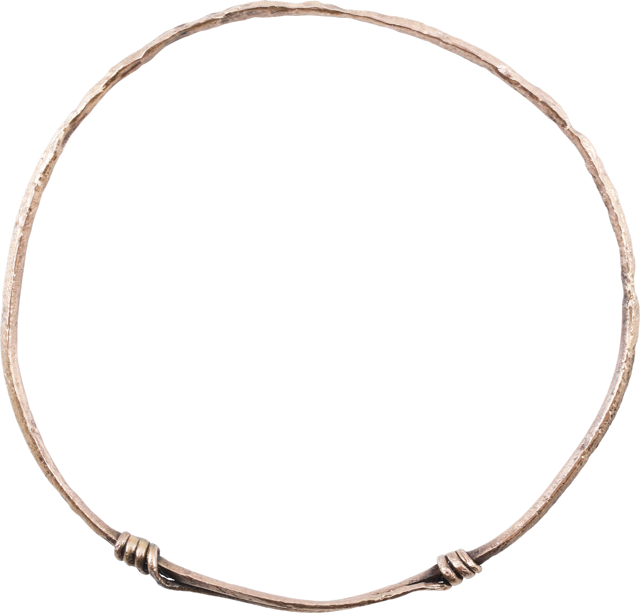 Gilt bronze, just under 3” (2.95”) inside dimension. Triangular section, flat inside and ridged outside. Tapered over lapping terminals, coiled, securing the ends. Professionally refurbished with the 24karat gold surface restored. Gift boxed with certificate of authenticity.