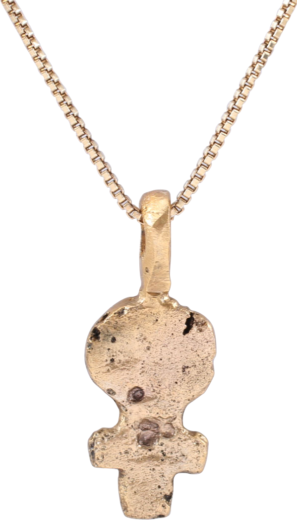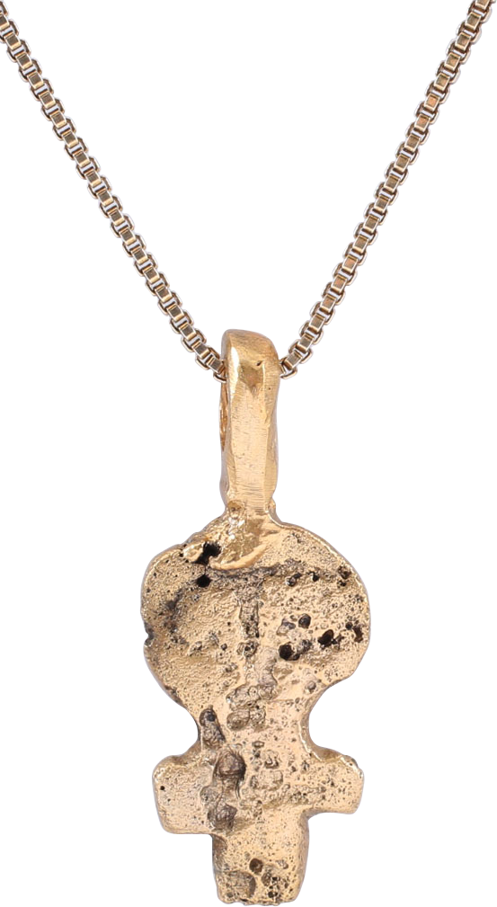 Based on the Ancient Egyptian underworld symbol, the ankh, the crux ansata signified life and eternal life. It is a cross with a loop or handle top said to represent a sandal strap. It was used with talismanic significance in art, particularly textiles. Its use as an amulet as here, is quite rare. This example is over 5/8” high (0.66”) plus the loop with some surface texture from burial. It has been professionally refurbished with the 24karat gold overlay restored and mounted on an 18” gilt Sterling silver neck chain, for contemporary wear. Gift boxed with a certificate of authenticity.