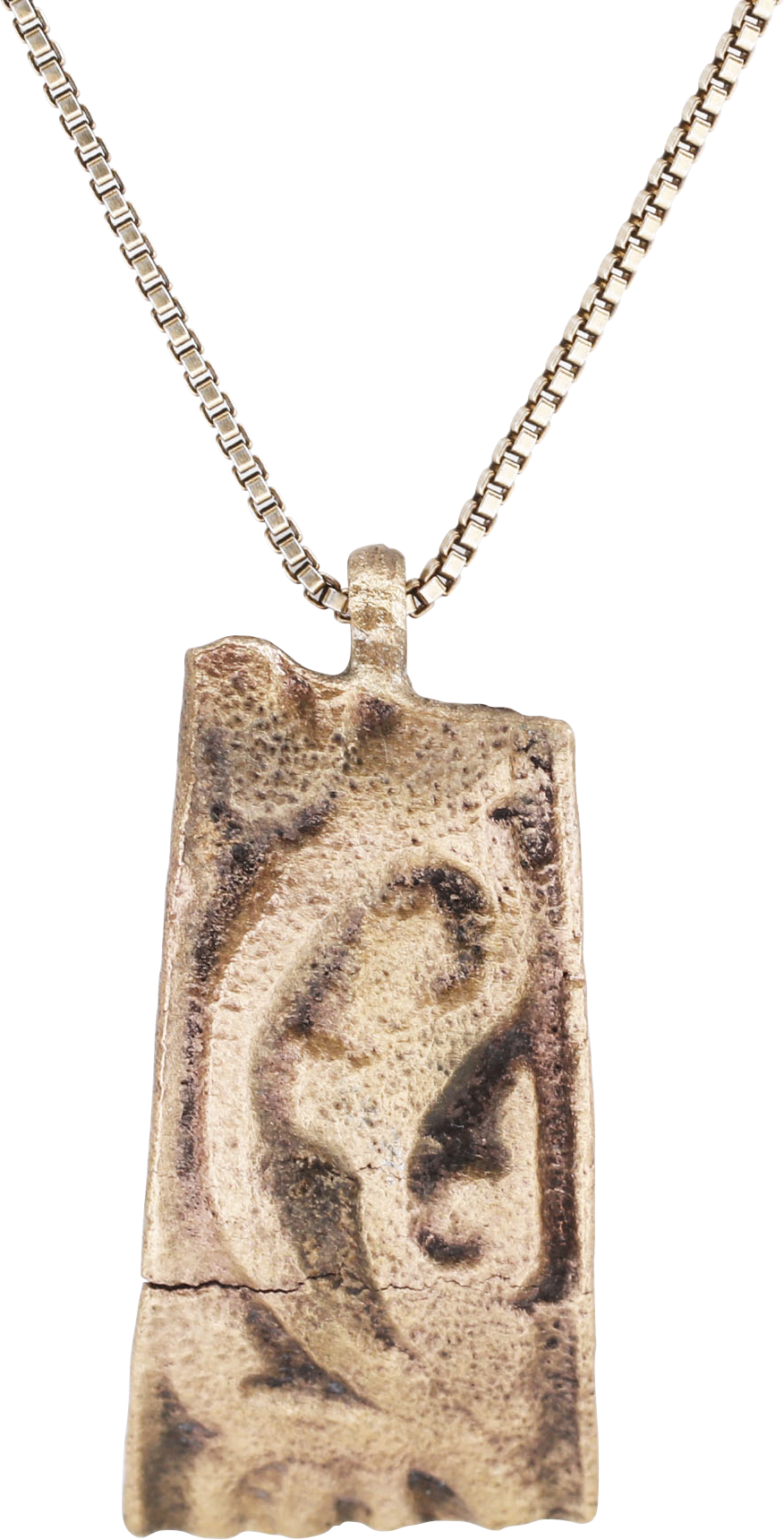 10th-11th century AD. Vikings were highly skilled metallurgists, and as a result, breaking metal had supernatural significance for them. Breaking ringjarn (iron rings) as shown on the Larbro Stone, was thought to destroy the spirits of enemies. Similarly, Viking weapons and accouterments were broken for burial with their owners. This is the broken end of a fine Viking woman warrior's bronze bracelet. It is about ½” x 7/8” with raised borders and decorated with curvilinear foliage. The surface is textured from burial.  It was handcrafted by a Viking artisan 1000 years ago! It has been professionally refurbished with a 24karat gold overlay and mounted to an 18” gilt Sterling silver neck chain for modern wear. It comes with certification of authenticity, and gift boxed.