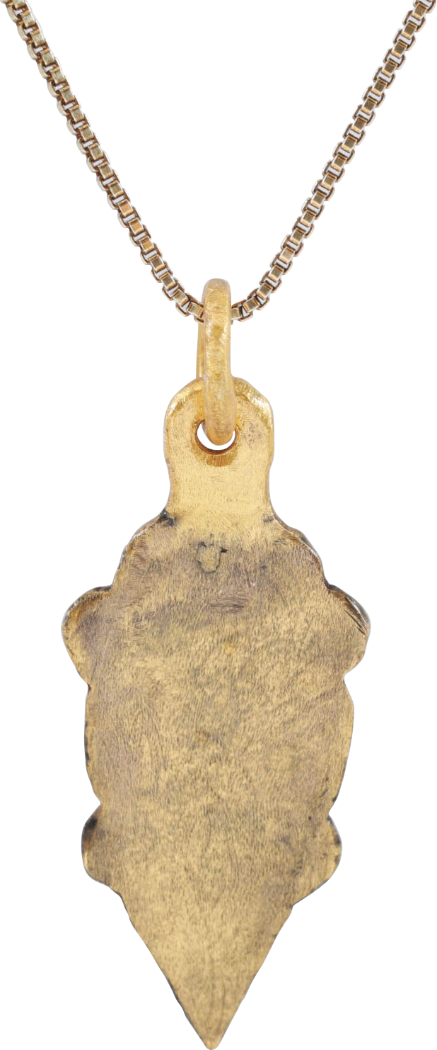 The form is unmistakably Viking, with the surround identical to earlier examples and the heart form found in Viking period jewelry as well. Slightly under 1” (0.98”) height plus the suspension loop. Professionally refurbished with the 24karat gold surface restored, on an 18" gilt silver neck chain for modern wear. Gift boxed with certificate of authenticity.