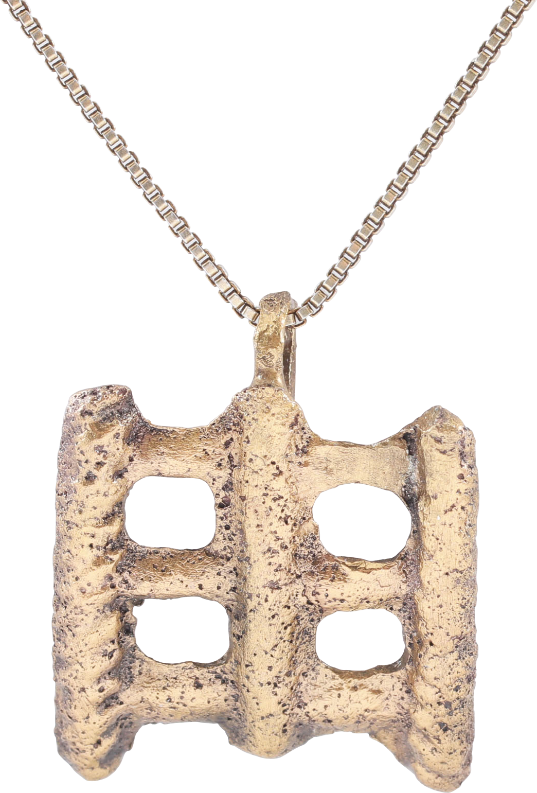 This is the broken portion of a Viking woman warrior's bronze bracelet. It is about ¾” square with three spiral or scrolling bars connected by three transverse bars. The surface is lightly textured from burial. It was handcrafted by a Viking artisan 1000 years ago! It has been professionally refurbished with the 24karat gold overlay restored and mounted to an 18” gilt Sterling silver neck chain for modern wear. It comes with certification of authenticity, and gift boxed. Interest variant form.