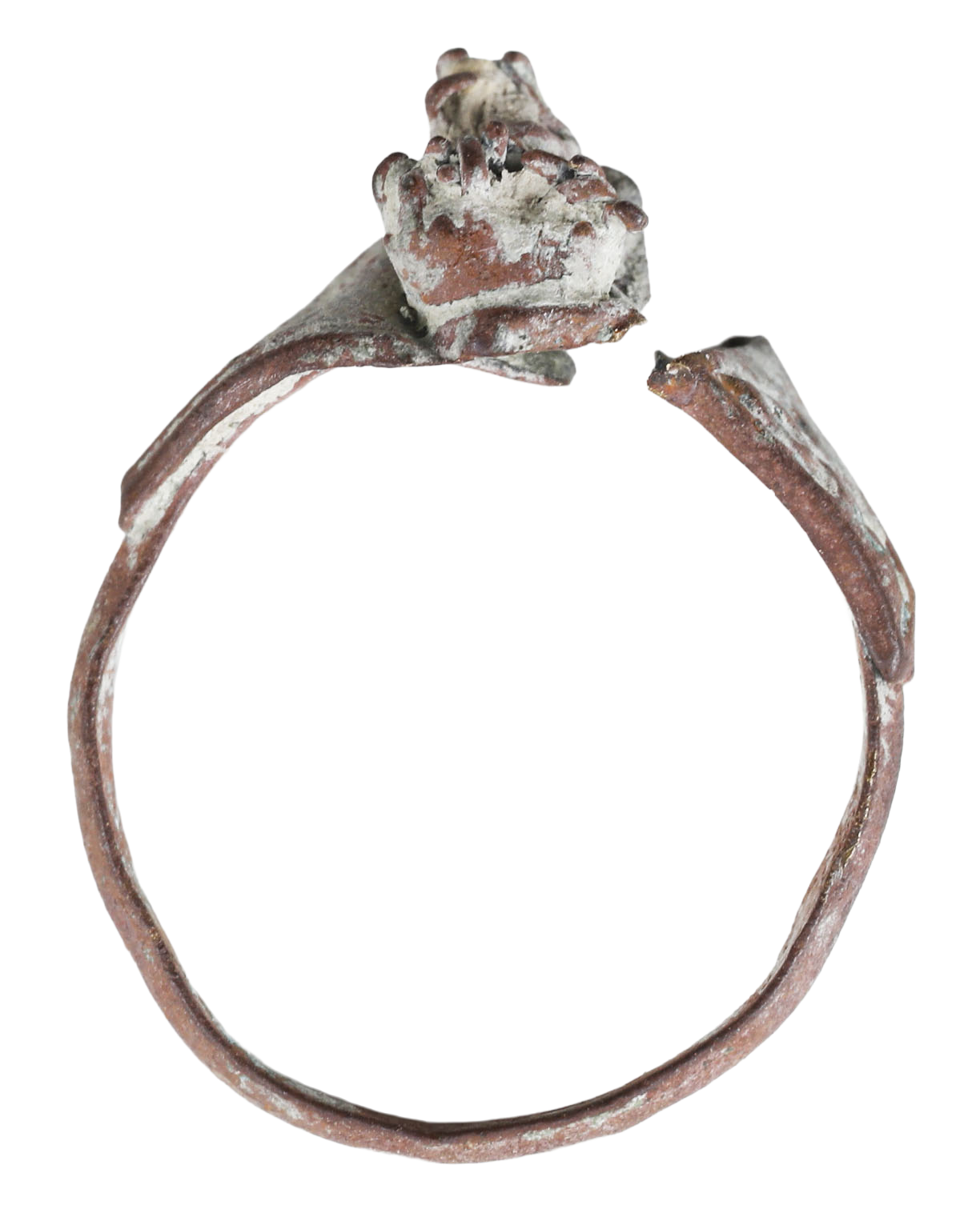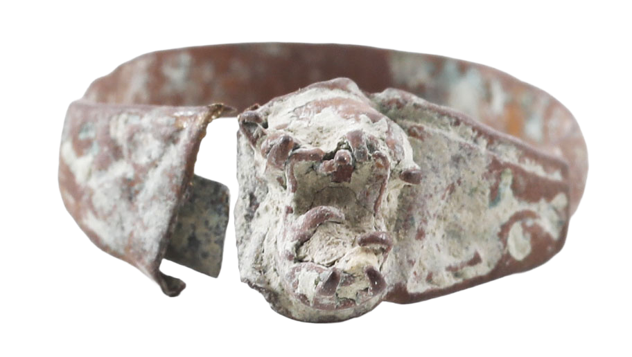 Brass or bronze, about size 4 ½ with 2.8mm rounded face band. Separately attached bezel modeled as a flower. The band broken, accounting for its loss until recently found. As found with soil adhering. Untouched pre Revolutionary relic.