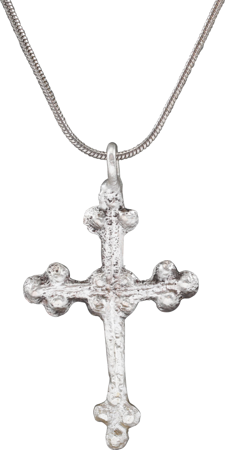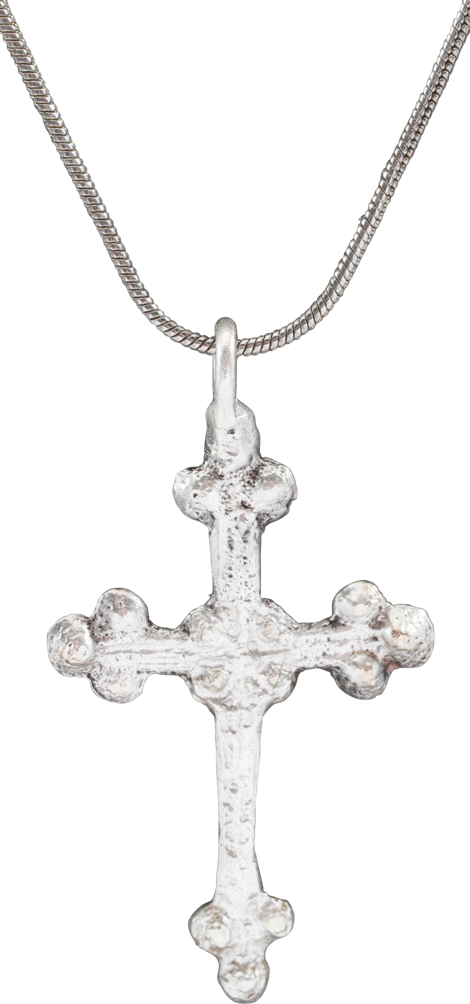 14th-15th century. Over 1 5/8” (1.67”) total height. Slender beams with rounded terminals and “crutches" of the Jerusalem cross. Five crosses in one representing the five wounds of Christ. The cross beam above center with a saltire at the junction. Fine elegant form. On a Sterling silver neck chain for contemporary wear. Gift boxed with certificate of authenticity.
