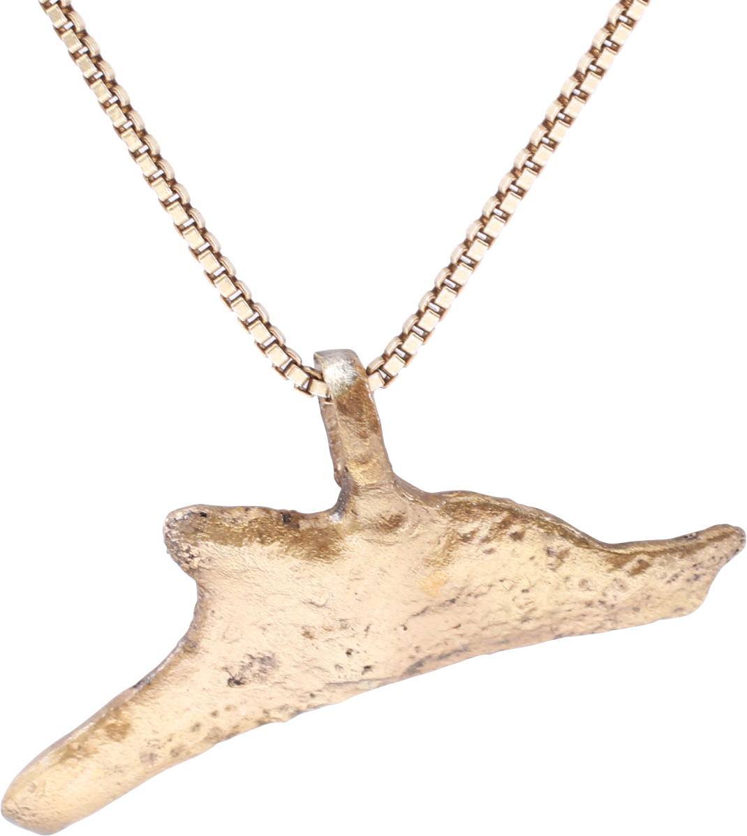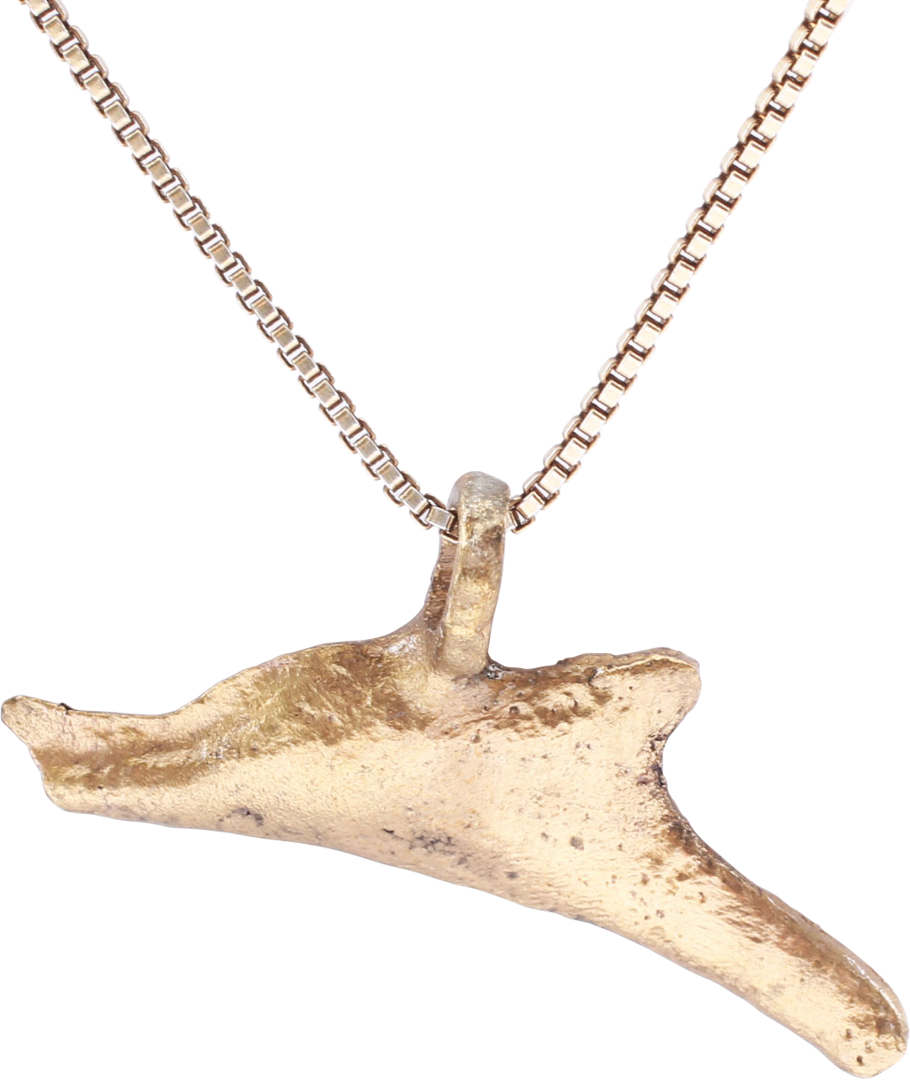 This example is over 1" (1.02”) long with delineated eyes, prominent bottle nose, and dorsal fin. Surface textured from burial, it has been professionally refurbished, 24karat gold plated on a modern gilt Sterling silver 18” neck chain. Jewelry gift boxed with certificate of authenticity.