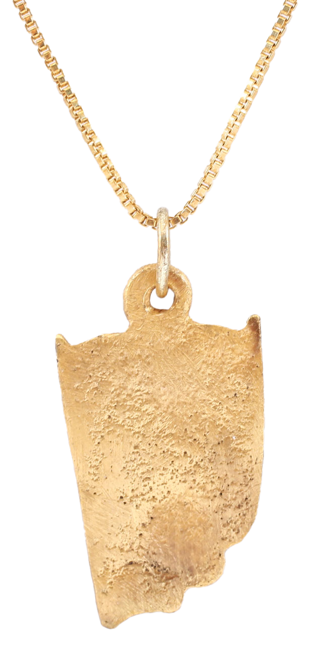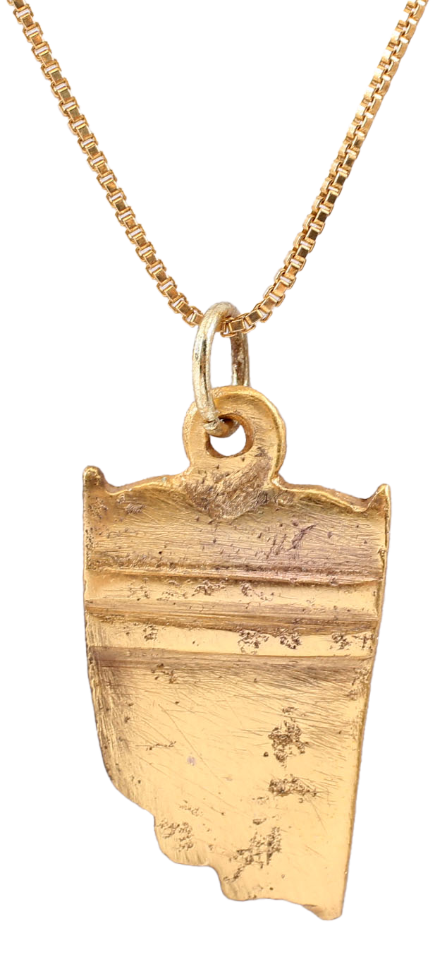 Gilt bronze, just under 1” total height. Asymmetrical form with double barred top and serpentine bottom. Likely a topographic representation of the estate or state of the owner, bordered by a river. Professionally refurbished with the 24karat gold surface restored and mounted on an 18” gilt silver neck chain for modern wear. Gift boxed with a certificate of authenticity.