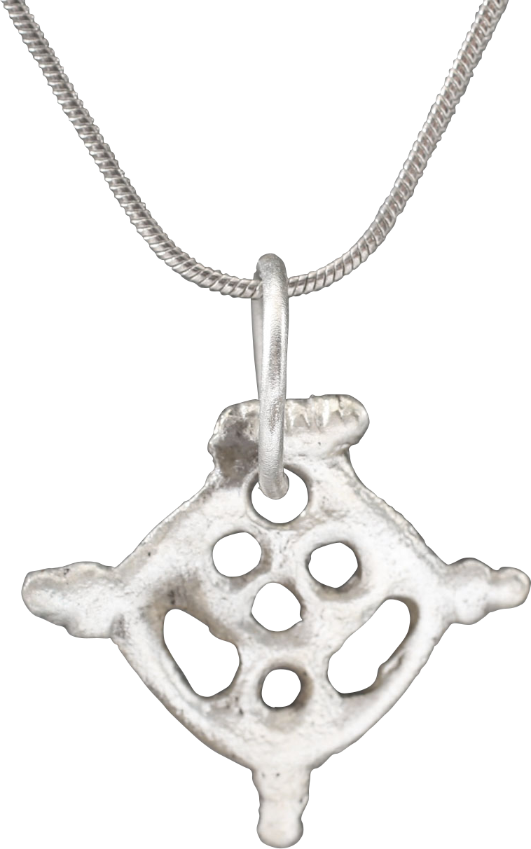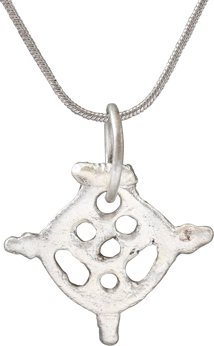 Silvered bronze, circular with a pierced matrix. That form evolved from the earlier crusader’s crosses. Trefoil nubs at the quarter points defining a cross with “crutches having been an element in the arms of Godfrey Bouillon which he wore during the First Crusade. Godfrey of Bouillon was a Frankish Knight of the First Crusade, known as Baron of the Holy Sepulcher and the Crusader King, ruler of the Kingdom of Jerusalem following its victorious siege in the First Crusade. For that reason, it is also known as the Jerusalem Cross. The top with an armorial bar indicating that the owner was of the noble class. Just under 1” (0.97”) height. The silver surface restored and suspended from an 18” sterling silver neck chain for modern wear. Gift boxed with certificate of authenticity.