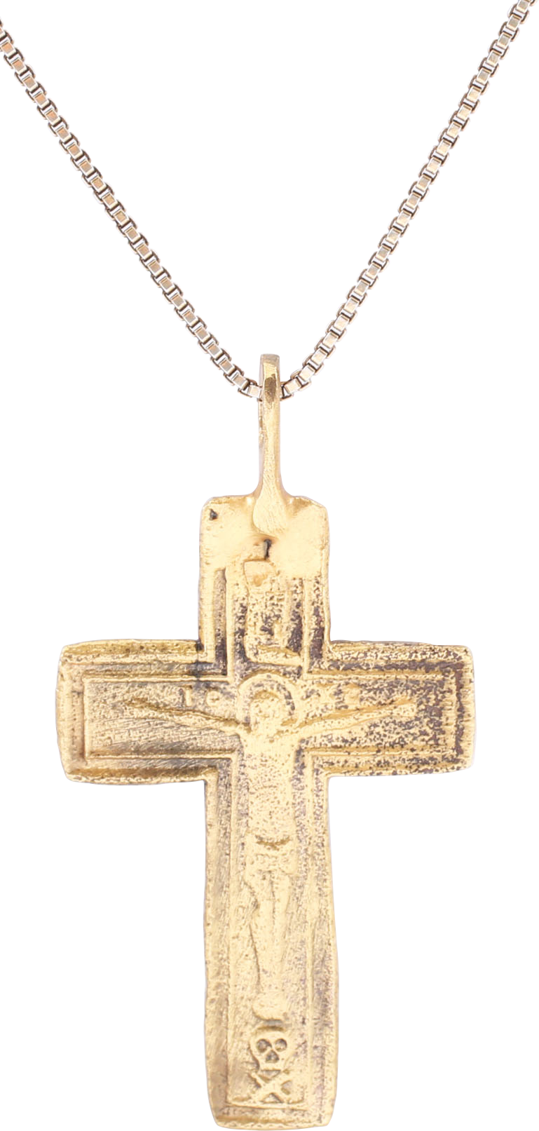 Gilt brass, 1.19” height plus the suspension loop. The front with detailed Corpus Christi above memento mori (skull and crossed bones) and ciphers at the beam tips. Reverse with a stick cross and ciphers. Die struck as with coins, not cast. Lightly textured from burial.