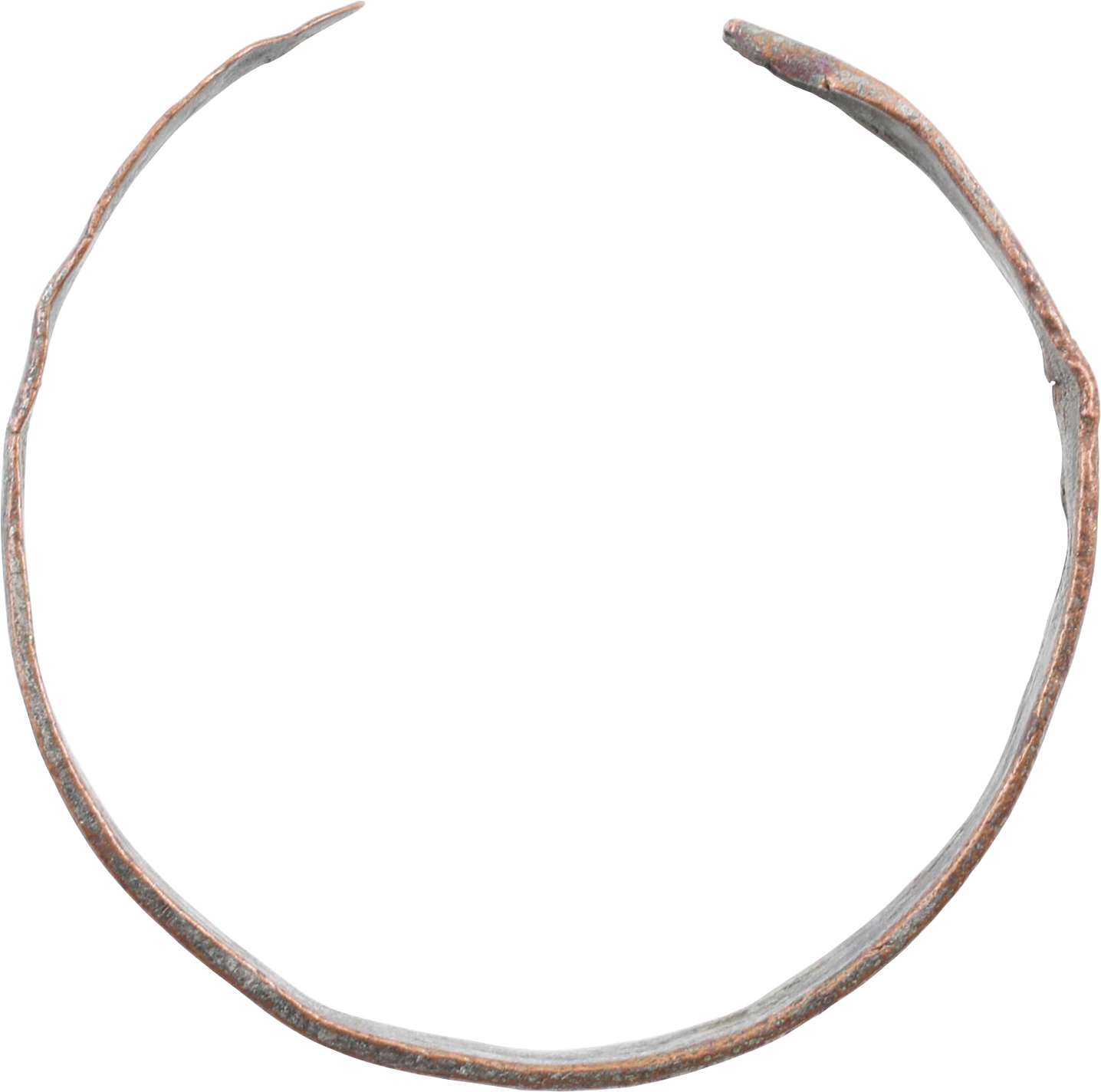 Provincial example, C form, 1.86” inside dimension for a small to average woman. As found untouched condition. Silvered copper, hand hammered to perfunctory finish. Near all of the silver surface remaining. Rare complete example.