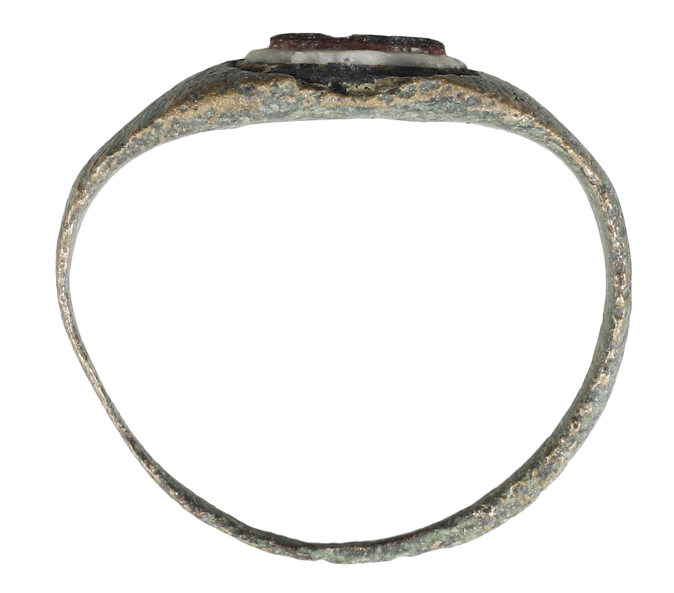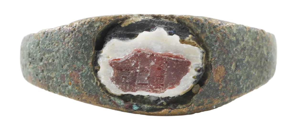 Oval form classified as Henig type III (Ancient Rings, Polio, P. 60). 0.6mm band swelling to the broad top which is mounted with an inscribed red and white “stone”, perhaps a segment of sea shell. As found with surface degradation to the metal.