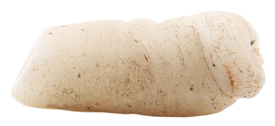 Predynastic and representing the earliest of formed glass beads. Beige glass, just over 1” length, heated and wrapped in the plastic state over a mandrel coated with a release agent. This example in its most primitive state with the folds of glass clearly evident. The stringing hole tapered as was the mandrel, which allowed for its removal after cooling. Chip to one end.