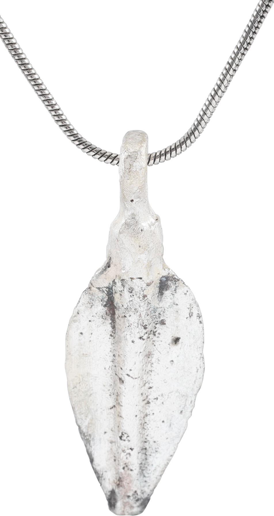Just under 1” length (0.99”) plus the suspension loop. Leaf shaped with strong conical socket/medial. The tip slightly blunted in battle. In the period, the Kingdom of Urartu, centered around the Armenian Highlands. It successfully fought the Assyrians early in the period and reached its greatest military power 785-760 BC under Argishti. It conquered territories along the Aras and Lake Sevan and frustrated Shalmaneser IV's campaigns against it. Professionally refurbished with a silver surface and mounted on an 18” silver neck chain for modern wear. Gift boxed with certificate of authenticity.