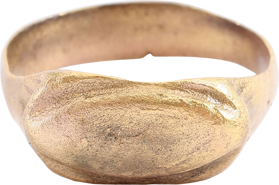 Gilt bronze. Rounded face band 5.0mm width. Elongated stepped bezel in the form of a squinting eye. It was believed that the evil eye or evil glance could cause misfortune and that it was necessary to employ protection in the form of an amulet or ring which could repel the evil. Professionally refurbished with the 24karat gold surface restored for contemporary wear. Gift boxed with a certificate of authenticity.