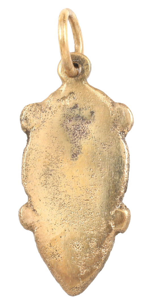 Danelaw England. Gilt bronze. Over 1” (1.03”) total height. Iconic heart form with nubs at the quarter points describing a saltire. The heart stood for bravery, fortitude, loyalty, integrity, all attributes of the Viking warrior. It is abundantly referenced in Viking literature. Professionally refurbished with the gold overlay restored for contemporary wear. Exceptional condition.