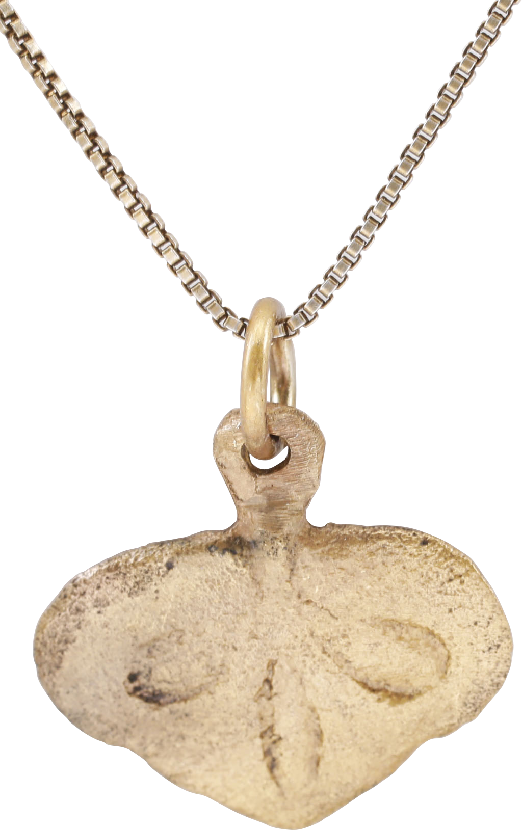 Classic heart form. over 7/8” (0.76”) width. Near flat form incised with a large well-delineated trefoil, a favorite Viking form. The bottom element with an angular cipher, perhaps a rune. The heart stood for bravery, fortitude, loyalty, integrity, all attributes of the Viking warrior. It is abundantly referenced in Viking literature. Surface textured from burial. Professionally refurbished with the 24karat gold surface restored on an 18” gilt Sterling silver neck chain for modern wear. Jewelry gift boxed with certificate of authenticity.