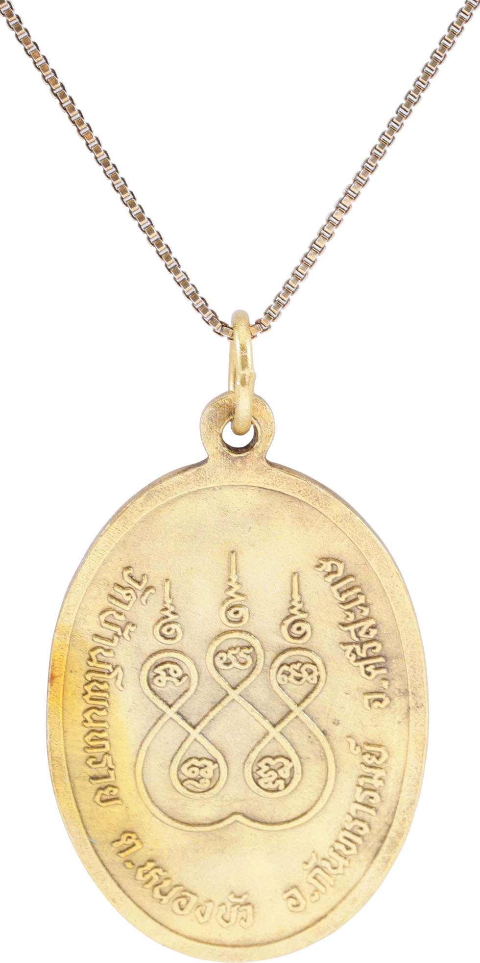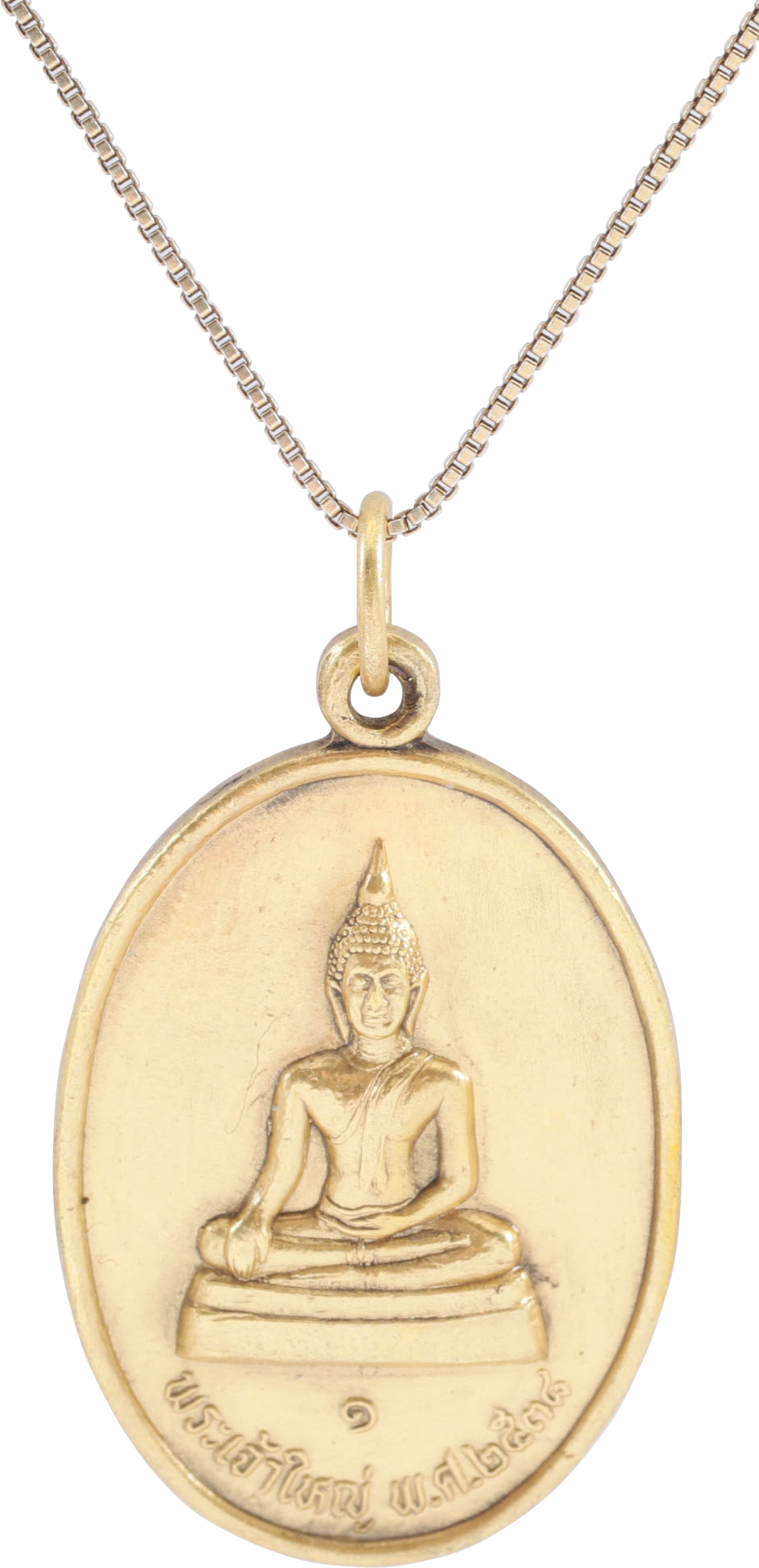 Oval over 1 3/8” height (1.40”) with a fine raised image of Buddha seated. The reverse with mystical knots and inscriptions to the edge. Die-struck coin quality. Bright gold finish intact.