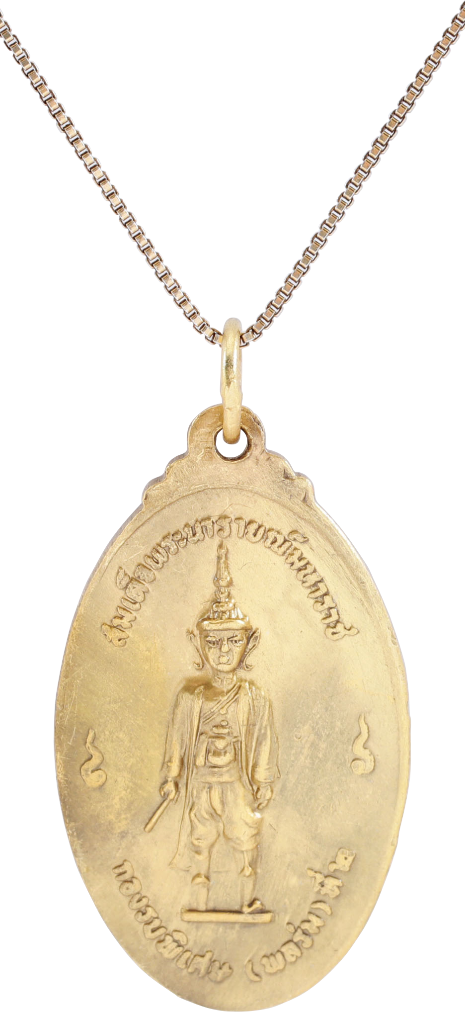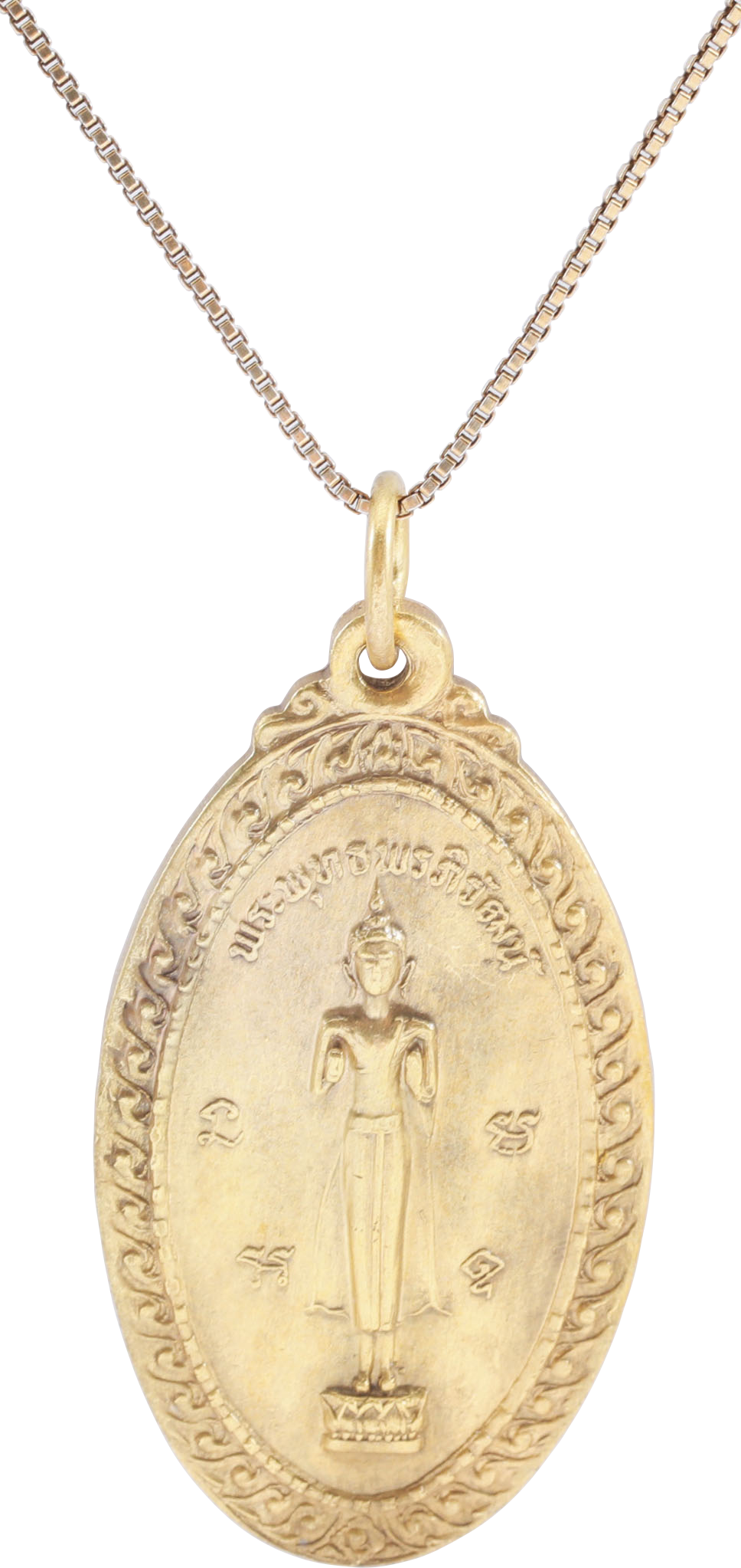Oval, under 1 1/82” height (1.48”) with a fine raised image of Manjusri with the Sword of Wisdom. The reverse with standing female figure with arms extended. Both with script captions. Die-struck coin quality. Bright 24karat gold finish intact.