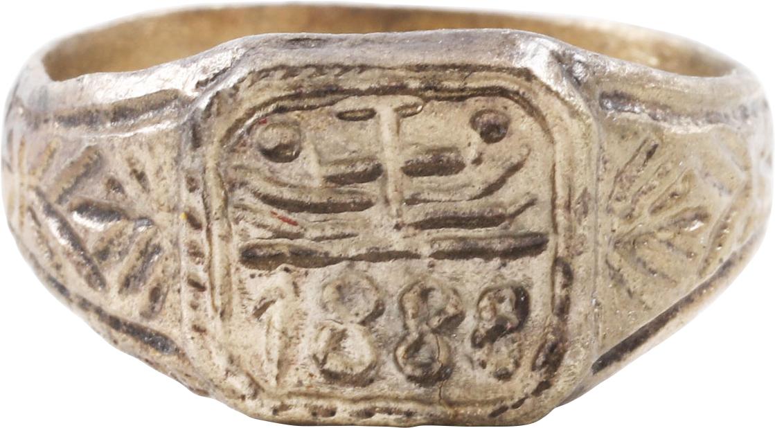Austro-Prussian War period. Gilt bronze, size 11 with rounded 4.5mm band flaring to the foliate engraved shoulders. Raised square bezel in two horizontal ranks with the top and bottom in rococo drapes. The bottom with date 1888. These rings were fashionable at the time particularly among Austrian soldiers. Professionally refurbished with the 24karat gold surface restored and is jewelry gift boxed with a certificate of authenticity. Handsome, attractive wearable example.