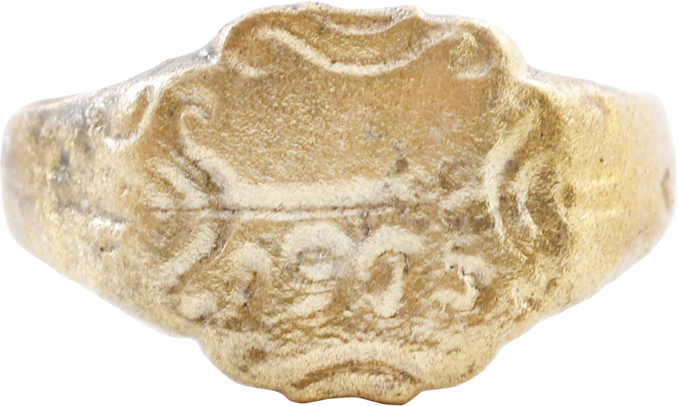 This type was popularized in the last decades of the 19th century with the military build up and occupation of Bosnia and Herzegovina in the Balkans by the Austro-Hungarian alliance against Russia. Size 10 with 3.4mm rounded face band flaring to the foliate decorated shoulders. Elaborate rococo scrolling edged bezel with a bar over 1905. Gilt bronze with the 24karat gold surface restored. Gift boxed with certificate of authenticity.