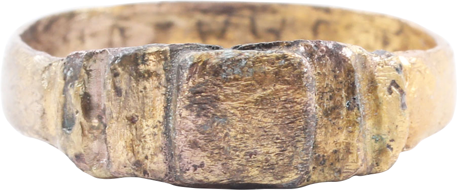 Gilt bronze, size 10 with 4.7mm flat band flaring slightly to the stepped shoulders which flank a central raised square bezel. The form similar to prostitute’s rings of the Roman and later period. Professionally refurbished with the 24karat gold overlay restored. Jewelry gift boxed with a certificate of authenticity.