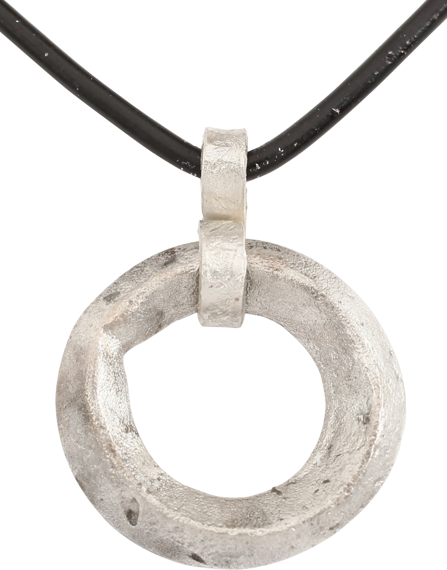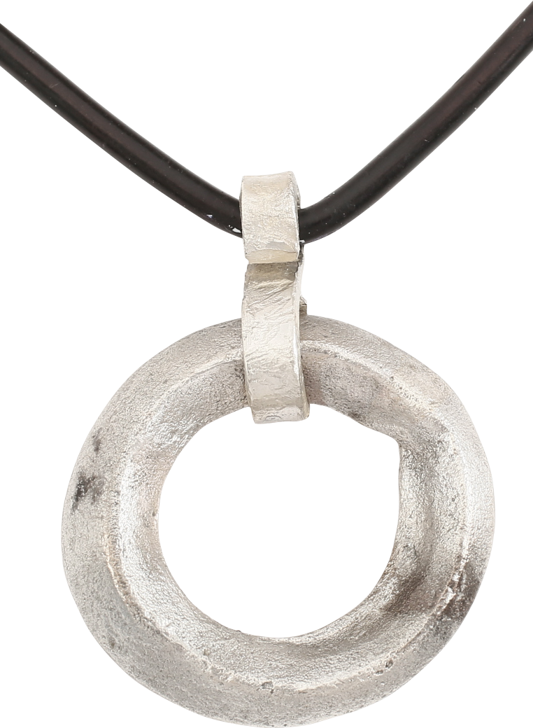 Before the Roman invasion of the British Isles, rings of bronze, silver, and gold were used as a means of exchange, particularly in Ireland. Most exchanges of goods and property were conducted by barter based on shrewd evaluations in each specific situation. Some, including bride prices, later to be called dowries, needed to be more accurately quantified. These rings fulfilled that need as well as providing a palpable demonstration of value. They were worn, sewn to men’s leather jerkins as displays of prosperity. Further, when worn in sufficient numbers, they provided substantial protection from an edged weapon attack. So very like armor in the Middle Ages, they advertised that the wearer was successful economically which translated both by implication and demonstration that he was a formidable objective, best left in favor of something more easily overcome. This example is slightly over 7/8” (0.91”) diameter of fine robust form with ridged faces and edges (diamond section). The surface is textured from burial. Professionally refurbished with the silver overlay restored and suspended on a Sterling silver mounted polished leather neck cord for contemporary wear. Jewelry gift boxed with a certificate of authenticity.