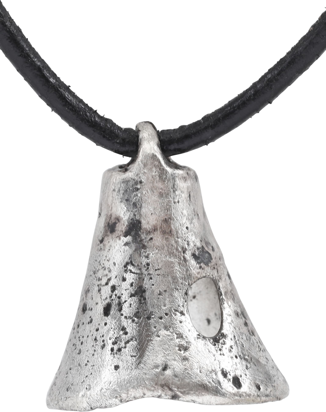 Found in Ireland, England (Scotland) and Western Europe. Bronze, over 7/8” (0.88”) height, delicately cast with integral suspension loop and of particularly flamboyant broad form. Generally acknowledged as exchange objects (money) these frequently are encountered with pieces chipped out. This example with a single piece chipped out. If valued as money and a sign of prosperity, it follows that the fragments were used votively as sacrifice. Professionally refurbished with silver surface overlay on an 18” modern Sterling silver mounted polished leather neck cord. Jewelry gift boxed with certificate of authenticity.