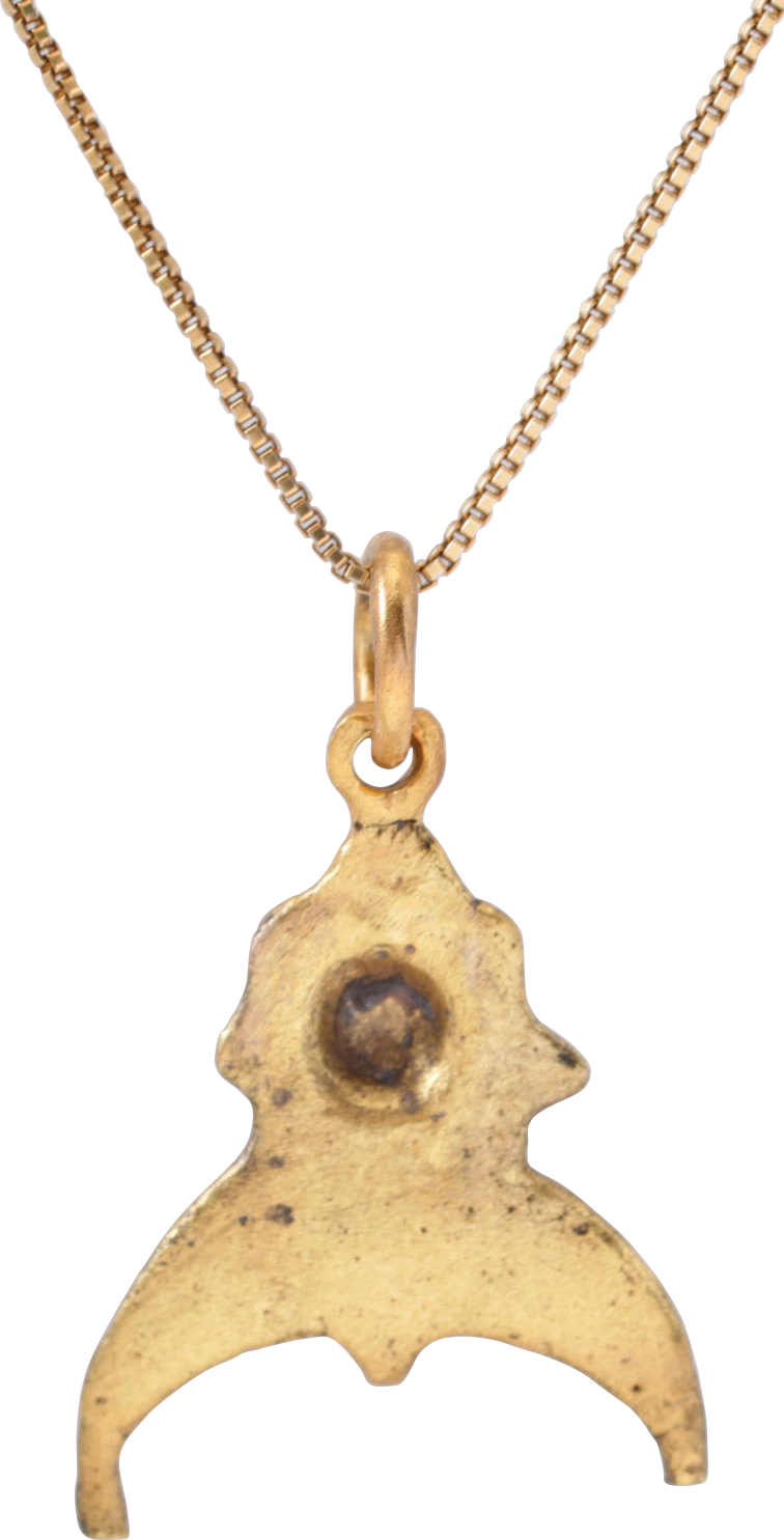 Just over 1” (1.08”) height. Bronze, cast, and chased as the raised edge crescent moon with baluster tips representing Sol the sun and Mani the moon. Above, a cone nested in radial triangular clusters of nubs perhaps an anatomical reference. Undoubtedly of astrological significance, now lost. Viking worship involved the heavenly bodies on which they relied for guidance when sailing. Fine quality. Excellent condition with the 24karat gold overlay restored and mounted on an 18” modern gilt silver neck chain for contemporary wear. Jewelry gift boxed with a certificate of authenticity.