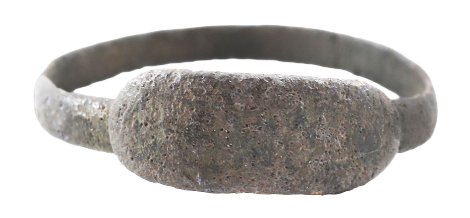 Simple construction and perfunctory quality. Brass (?) size 4 ¾ with 1.9mm rounded face band joined beneath the lozenge shaped bezel with faint monogram (D M D ?). As found condition. Quite crisp with verdigris/oxidation to the surface.