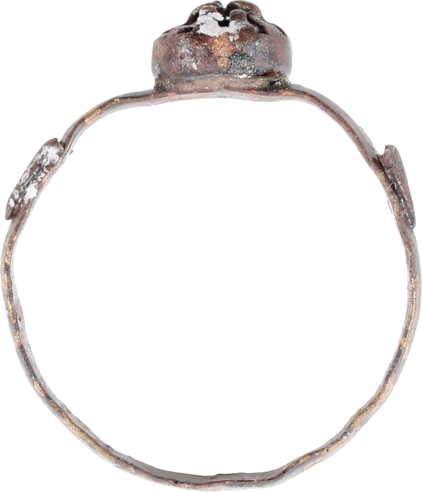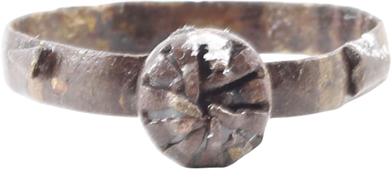 Bronze, size 10 with 3.2mm low rounded face band. Modeled bezel with domed radials forming a pseudo stone, flanked by biconicals. A ring for the middle class of rare larger size. Purchased as found in Hyannis in 1968. Gift boxed with certificate of authenticity.