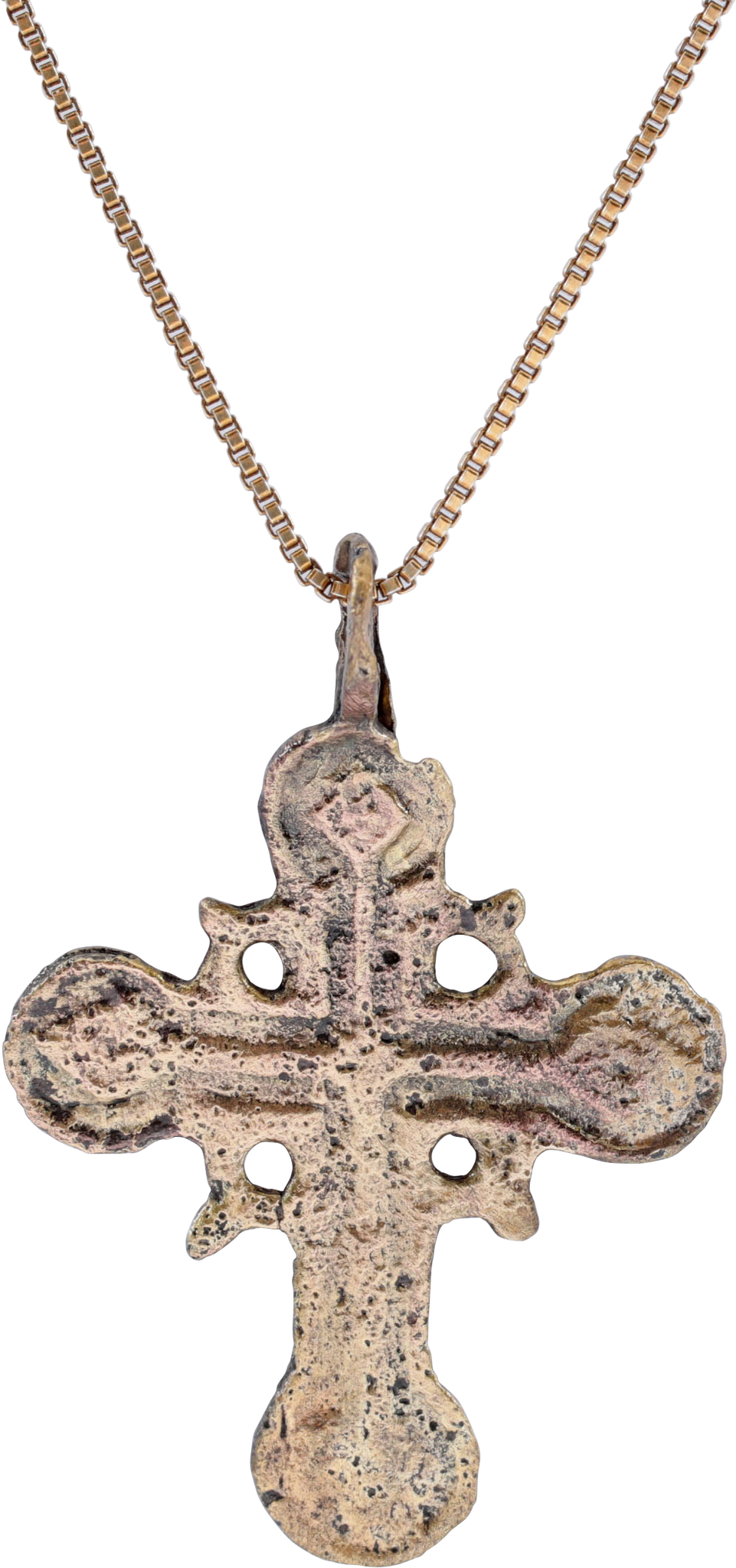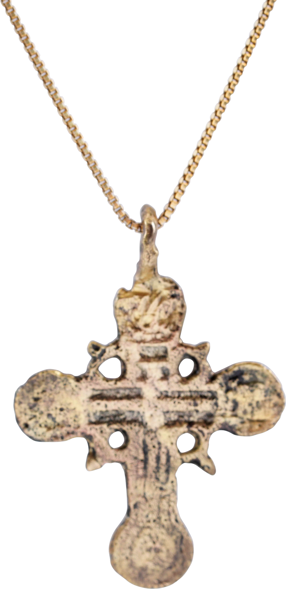 Ukrainian or Russian. About 1 ½” (1.44”) height modeled in high relief. Central vacant cross with triangular terminals nested in bordered circles. The junction with scalloped halo with nub tip radials forming a saltire. Reverse with similar cross with figural beam ends. Light surface texture from burial. Professionally refurbished with the 24karat gold overlay restored on an 18” gilt Sterling silver neck chain for modern wear. Jewelry gift boxed with certificate of authenticity.