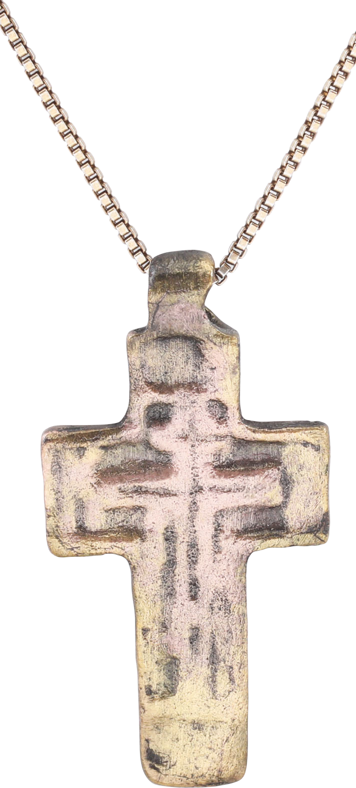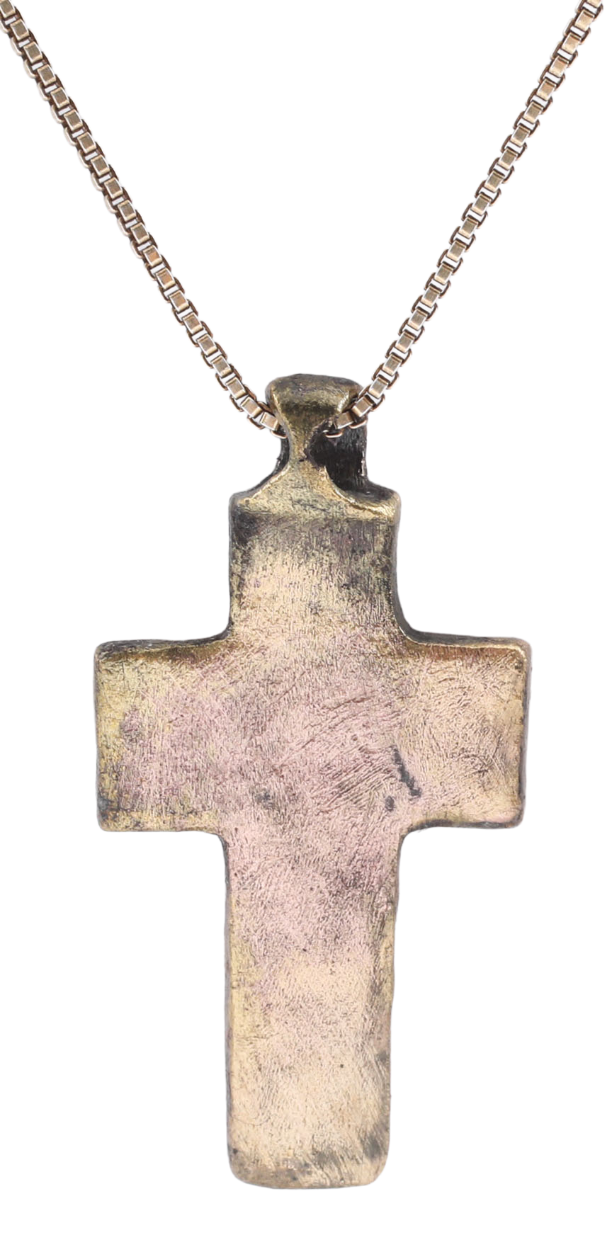 Gilt bronze, just under 1 1/4” (1.20”) height including the suspension loop. Raised edges with the cross beam above center. The front with a vacant cross with Cyrillic ciphers at the terminals. Reverse plain as with the earliest examples. Wear from use and burial. Professionally refurbished with the 24karat gold restored on an 18” gilt sterling silver neck chain for modern wear. Jewelry gift boxed with certificate of authenticity.