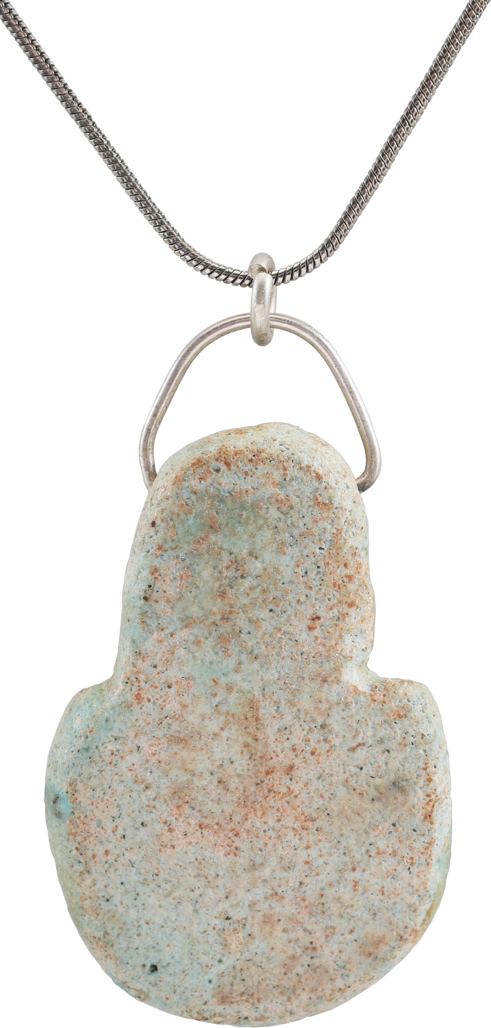 Faience, 1 ½” height modeled as a pharaoh in a desert hood with aegis. These were made in Egypt for sale to primarily English youths who, upon achieving the age of 21, would take a once in a lifetime tour of the ancient monuments and sites to complete their educational experience. They were sold as genuine, as were reproductions of ancient pottery and other artifacts. Mounted for modern wear with silver suspension and sterling silver neck chain. Genuine antique replicating the 3000-year-old original.