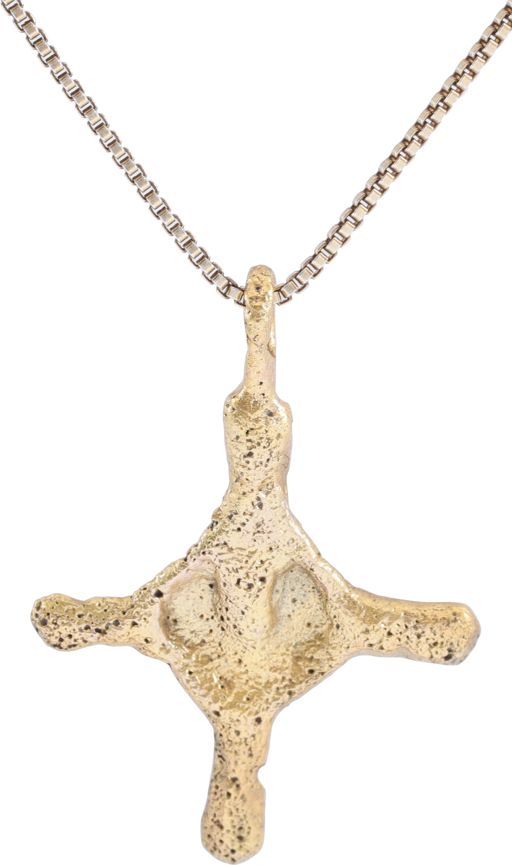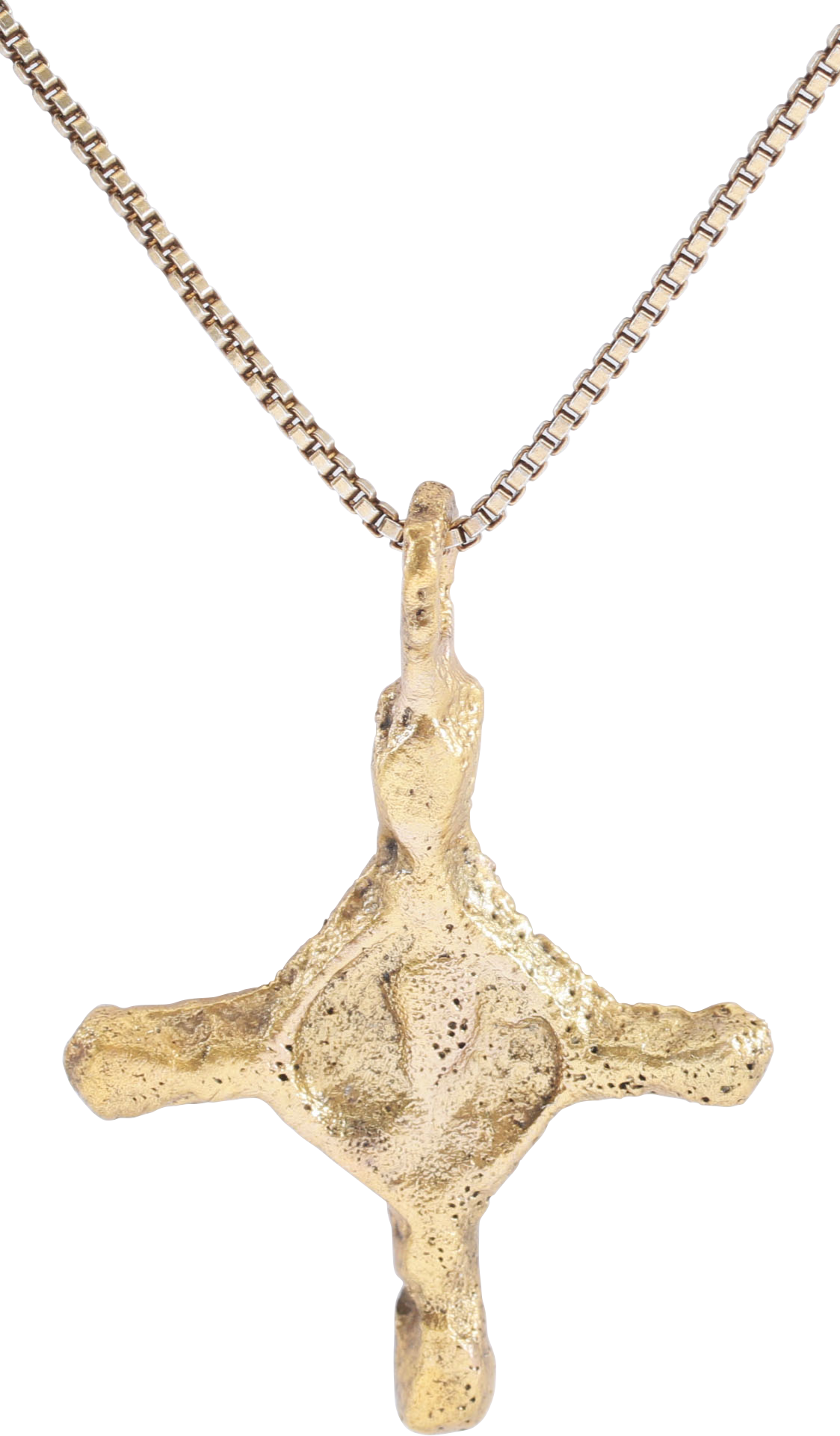 This example is just over 1 1/8” in height (1.13”) with a centered cross beam and a block at the junction with a ghostly figure of a saint on each side. The bulbous beam terminals have small nub ends. Quite smooth glossy surface throughout. Professionally refurbished with 24karat gold overlay restored on a gilt neck chain for modern wear.
