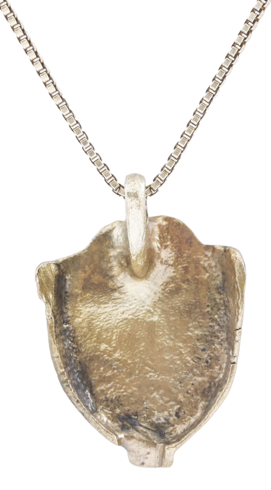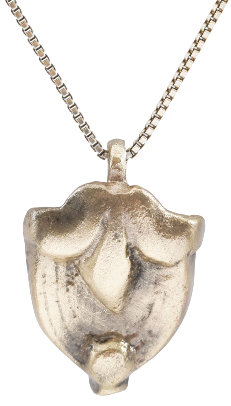 Gilt bronze, under ¾” (0.72”) plus the suspension loop. Shield shape and incorporating armorial elements including the fleur-de-lys which forms the top. The bottom with a further device, perhaps a beetle. Excellent preservation with the 24karat gold surface restored on an 18” gilt neck chain for modern wear. Gift boxed with certificate of authenticity. Worn to distinguish the wearer as a member of the upper or noble class.