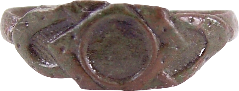 Bronze, size 7 ½ with 2.4mm rounded face band. Circular bezel between chevron and horse shoe (?) motifs. Excellent as found with fine glossy green patina.