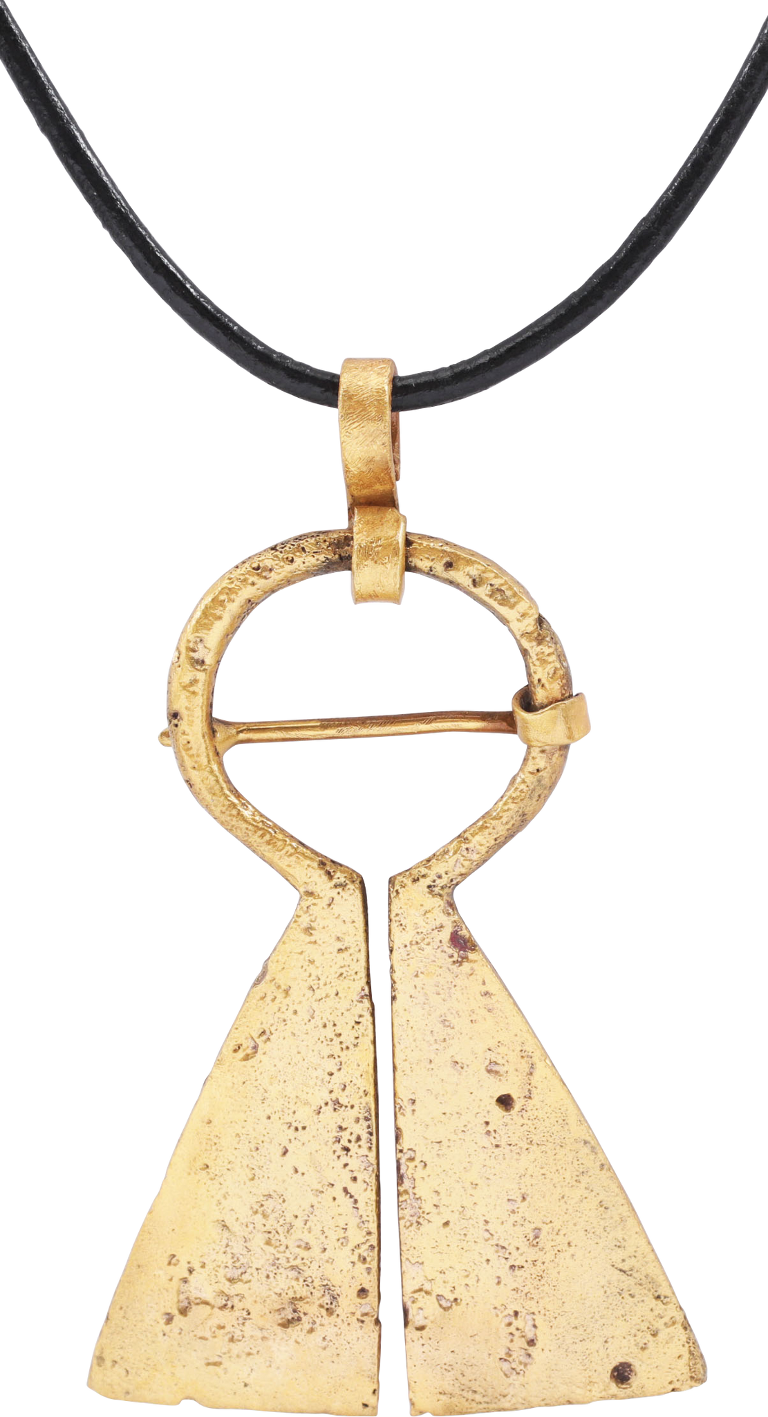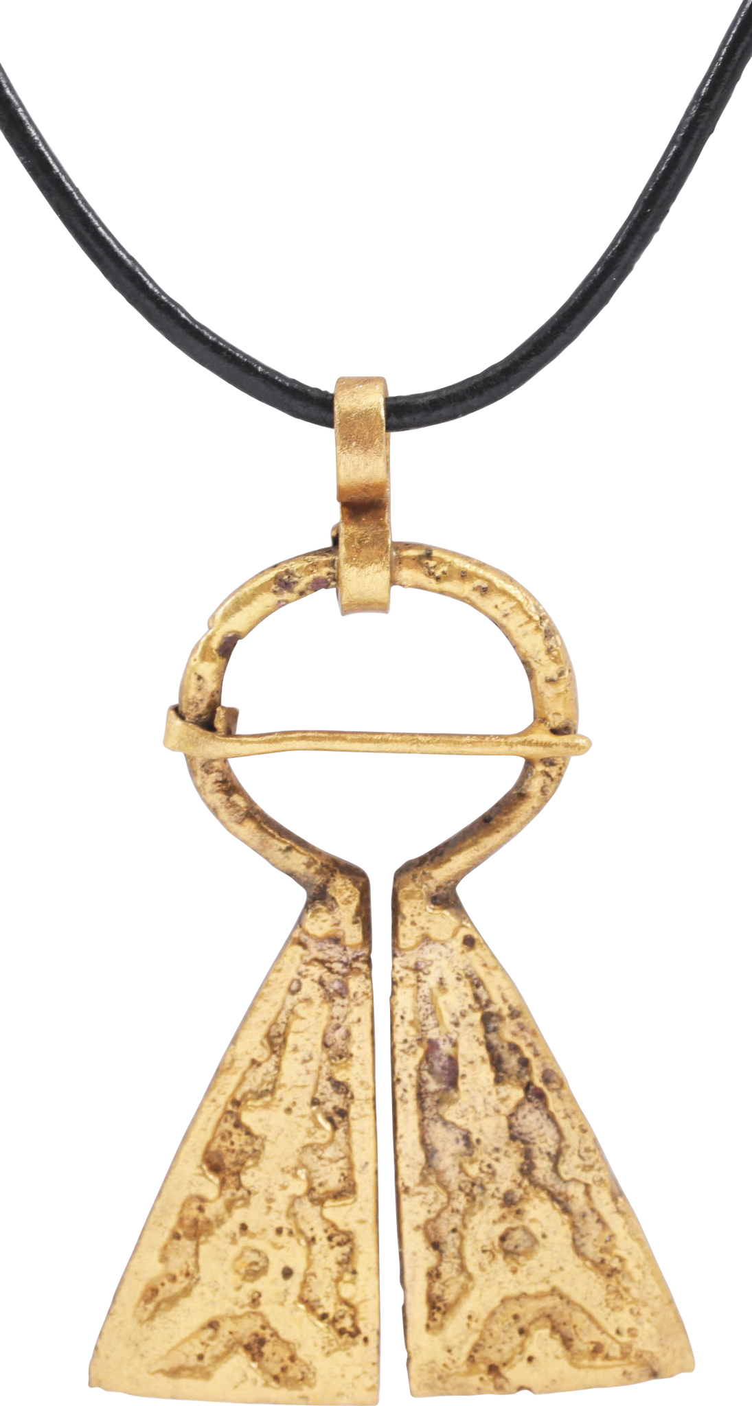 Large example, over 2” (2.09”) height of omega form. Circular top with large raised edge triangular terminals decorated in complex figures, undoubtedly of spiritual significance, perhaps representing roofs with spires. When fastened to the jerkin, these small metal brooches provided a measure of protection against sword cuts and, in fact, were a form of armor.  In addition to being more decorative, examples of this form provided added protection with the trailing tails. See current Public Television programming for documentation of these in action. As protectors, they also held spiritual significance for the warrior. Professionally refurbished with the 24karat gold overlay restored and suspended from an 18” gilt Sterling silver mounted polished leather neck cord. Gift boxed with certificate of authenticity.
