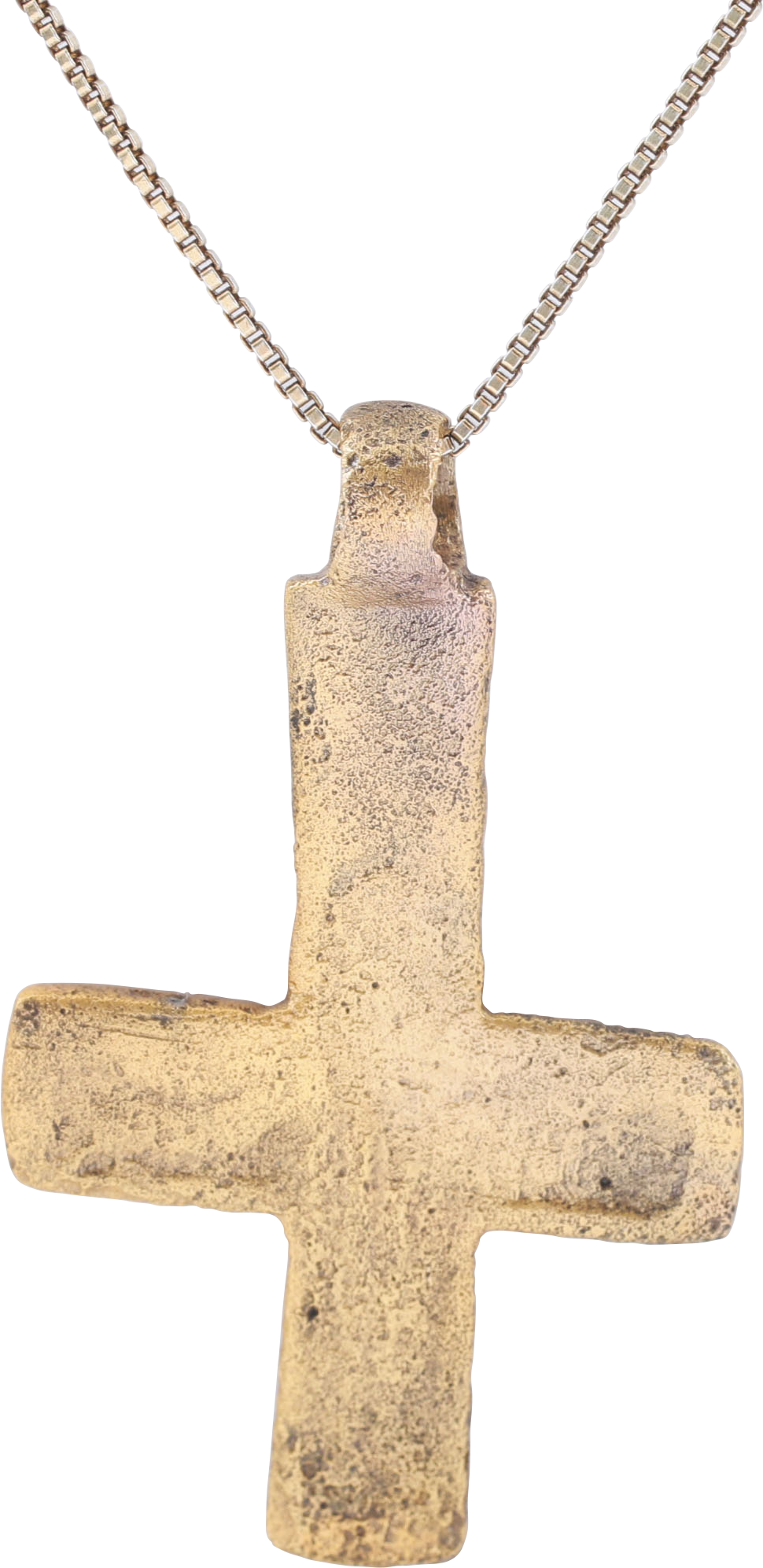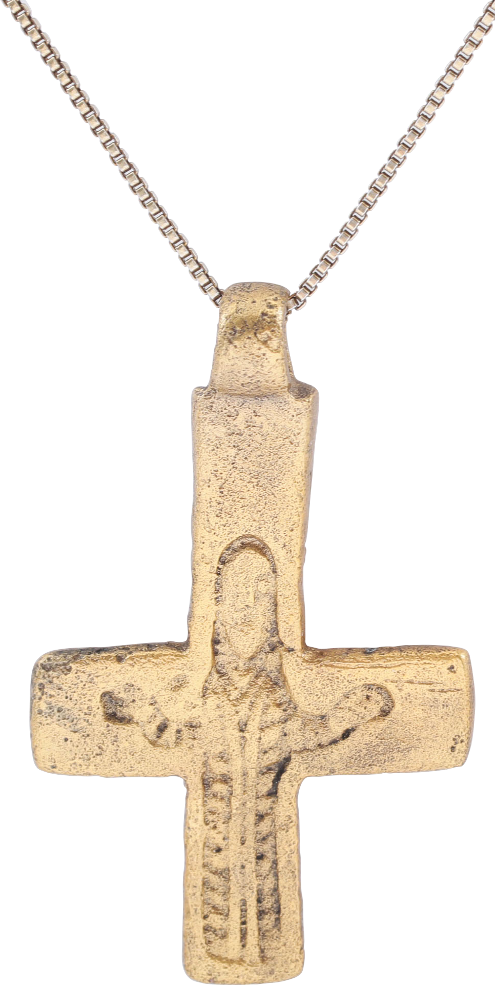 Medieval Europe, The Dark ages. Gilt bronze, over 1 ½’ (1.58”) total height. Early representation with the cross beam below center. Relief figure of Christ in the Orans position with garment fully detailed. No charges as with early examples. The reverse with a similar larger figure in lower relief. The two representations obviously intended to be different and likely of different figures, Christ of course and probably Peter who was crucified upside down possible explaining the upside down configuration of the cross. Surface textured from burial and restored with 24karat gold on an 18” gilt neck chain for modern wear. Gift boxed with certificate of authenticity.