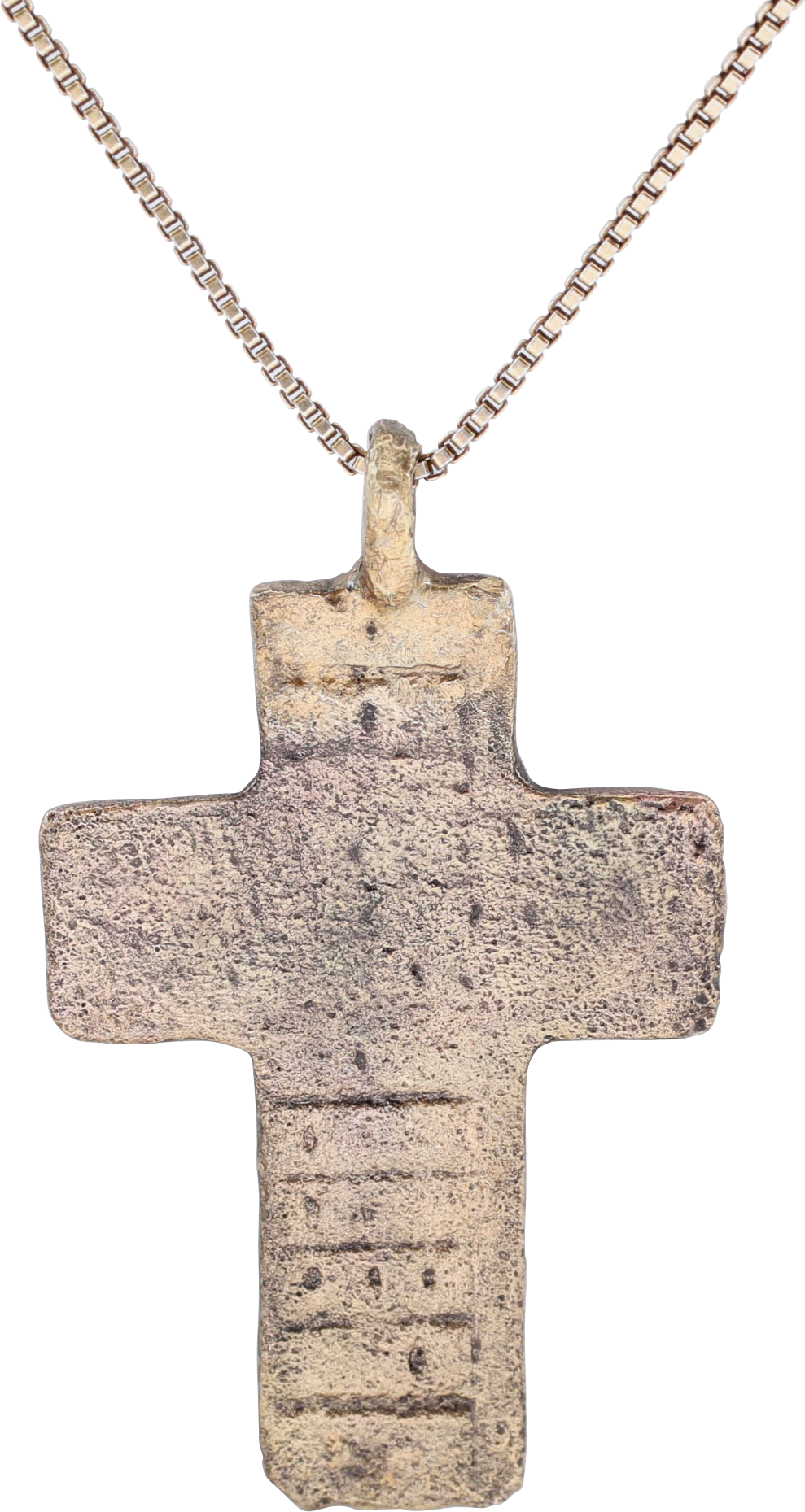 17th-18th Century, Orthodox rite. Gilt bronze, just over 1 3/8” (1.38”) height. Broad beams with raised edges and a plain cross center with charges and ciphers at the terminals. Reverse with Cyrillic text infill. Bordered with Cyrillic script infill. Surface textured from burial. Professionally refurbished with the 24karat surface restored, mounted on gilt Sterling silver neck chain for modern wear. Gift boxed with certificate of authenticity.