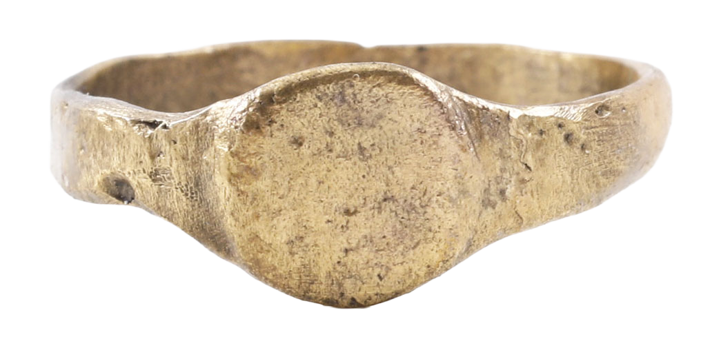 Late Roman/Byzantine period representing the late Imperial, fall of Rome and beginning of the Dark ages. Gilt bronze with the 24karat gold restored. 3.0mm flat band. Circular bezel possibly originally with a signet, obscured by degradation from burial. See Ancient Rings, Pollio, p.76 for another example. Gift boxed with certificate of authenticity.