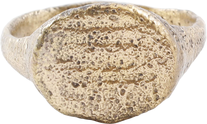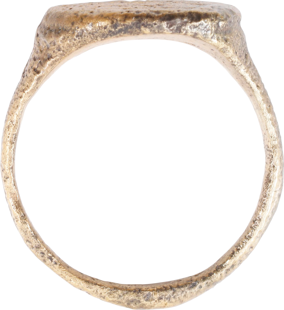 Late Roman/Byzantine period representing the late Imperial, fall of Rome and beginning of the Dark ages. Gilt bronze with the 24karat gold restored. 2.7mm deeply rounded band with the Roman nub to the bottom. Oval bezel with five lateral bars and further detail, obscured by degradation from burial. See Ancient Rings, Pollio, p.76 for another example. Gift boxed with certificate of authenticity.